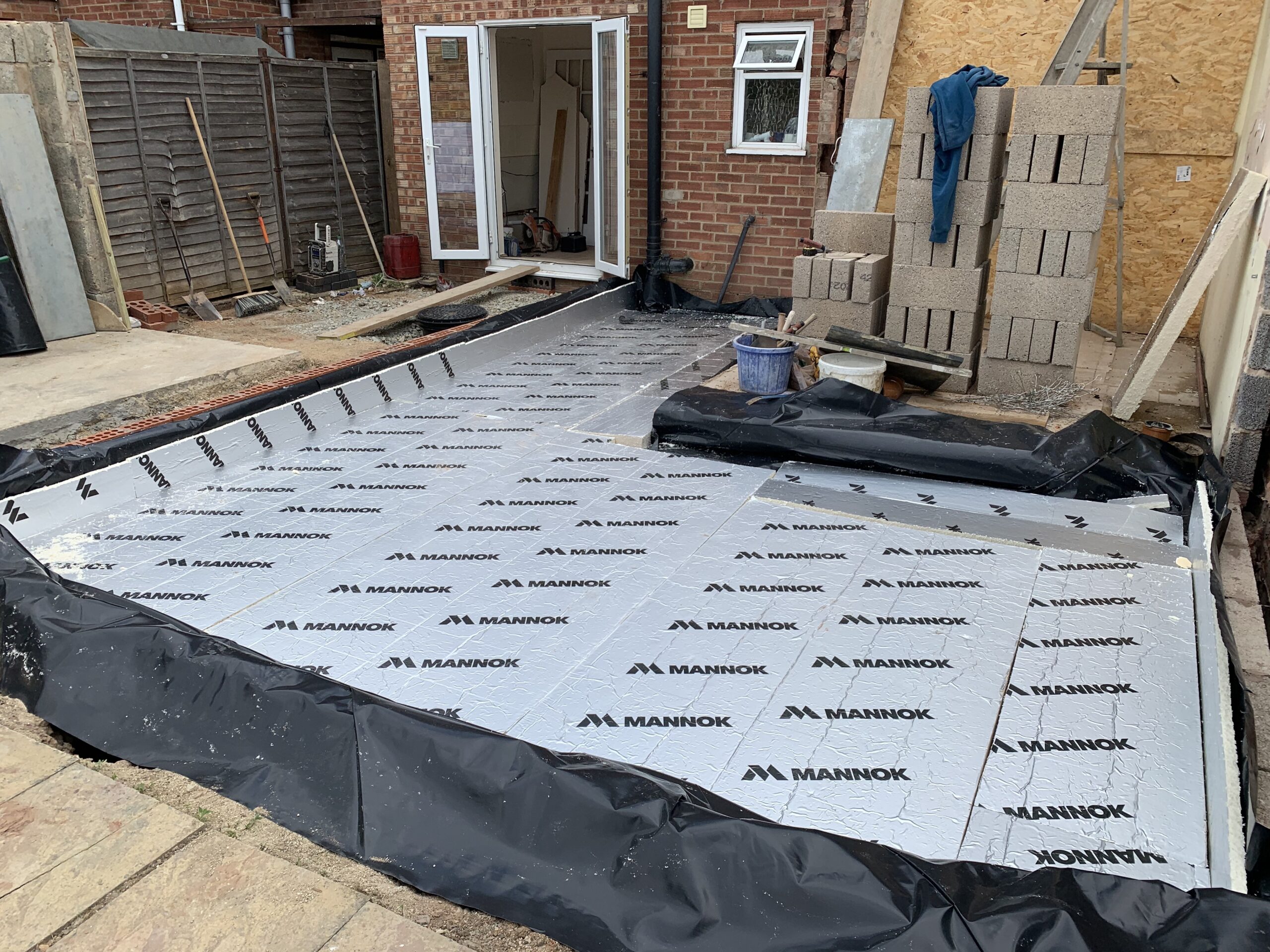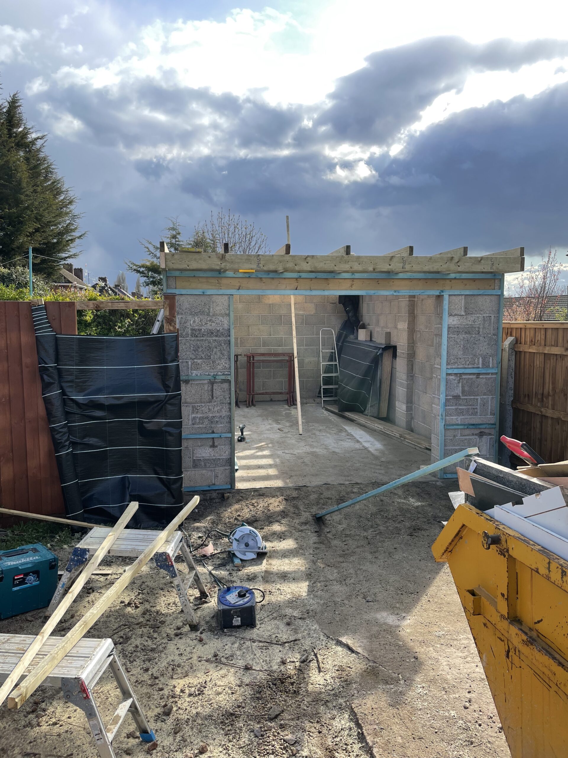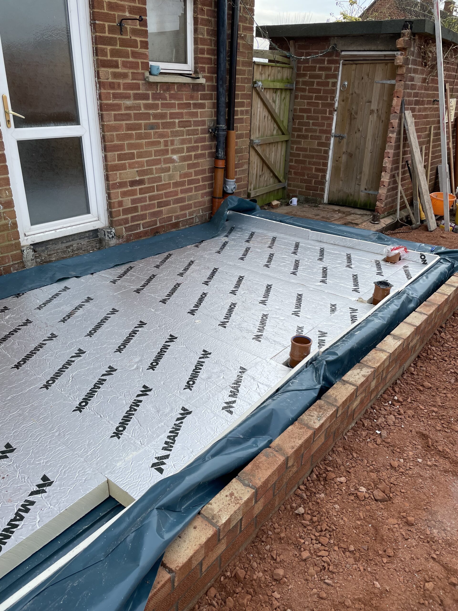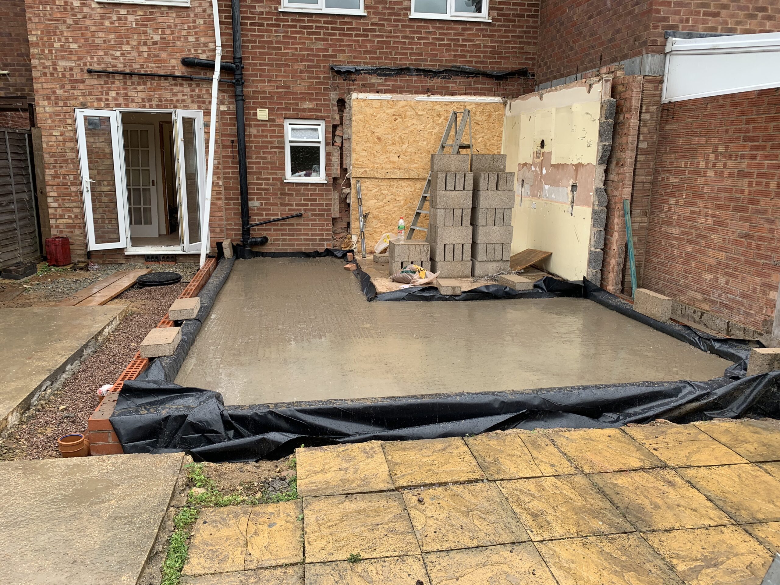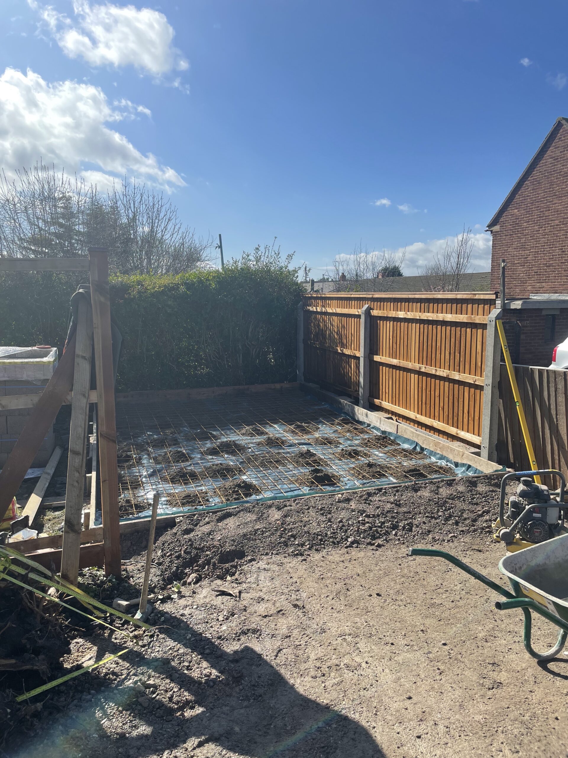 7000 x 3700mm garage built in Bredon, Worcestershire. The area was dug off and shuttering built to the dimensions of the building. The pad was then layered with 10 inches of type 1, compacted then a waterproof membrane installed to prevent any rising damp. The pad was reinforced with steel to strengthen as the buildings purpose was to accommodate a vehicle.