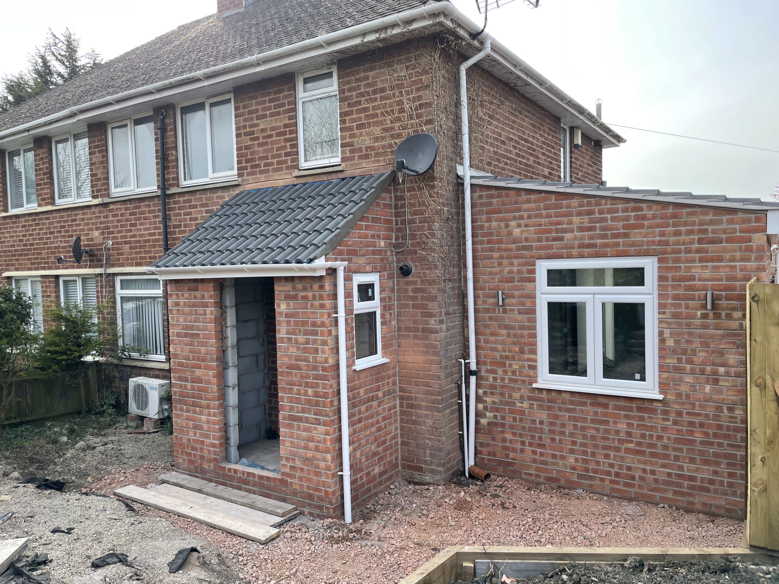 This project was to construct a single storey extension with a W/C in Bishops Cleeve, Cheltenham. We also removed an old, dated and damp prefab porch and constructed a small porch to the front of the property. The whole aspect of the build was managed by us meaning it was a carried out efficiently, on time and on budget.