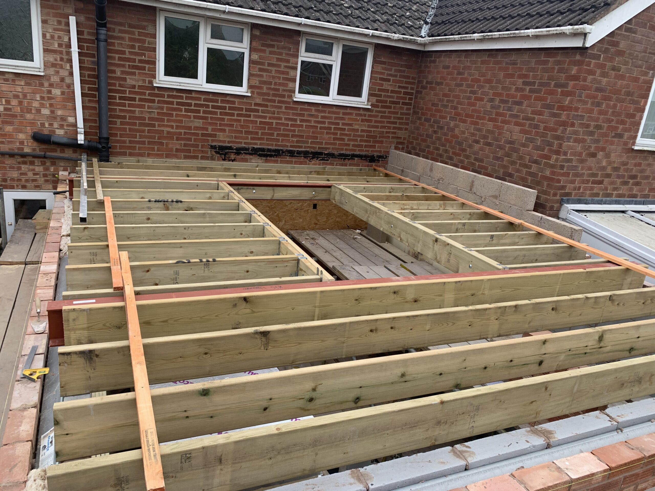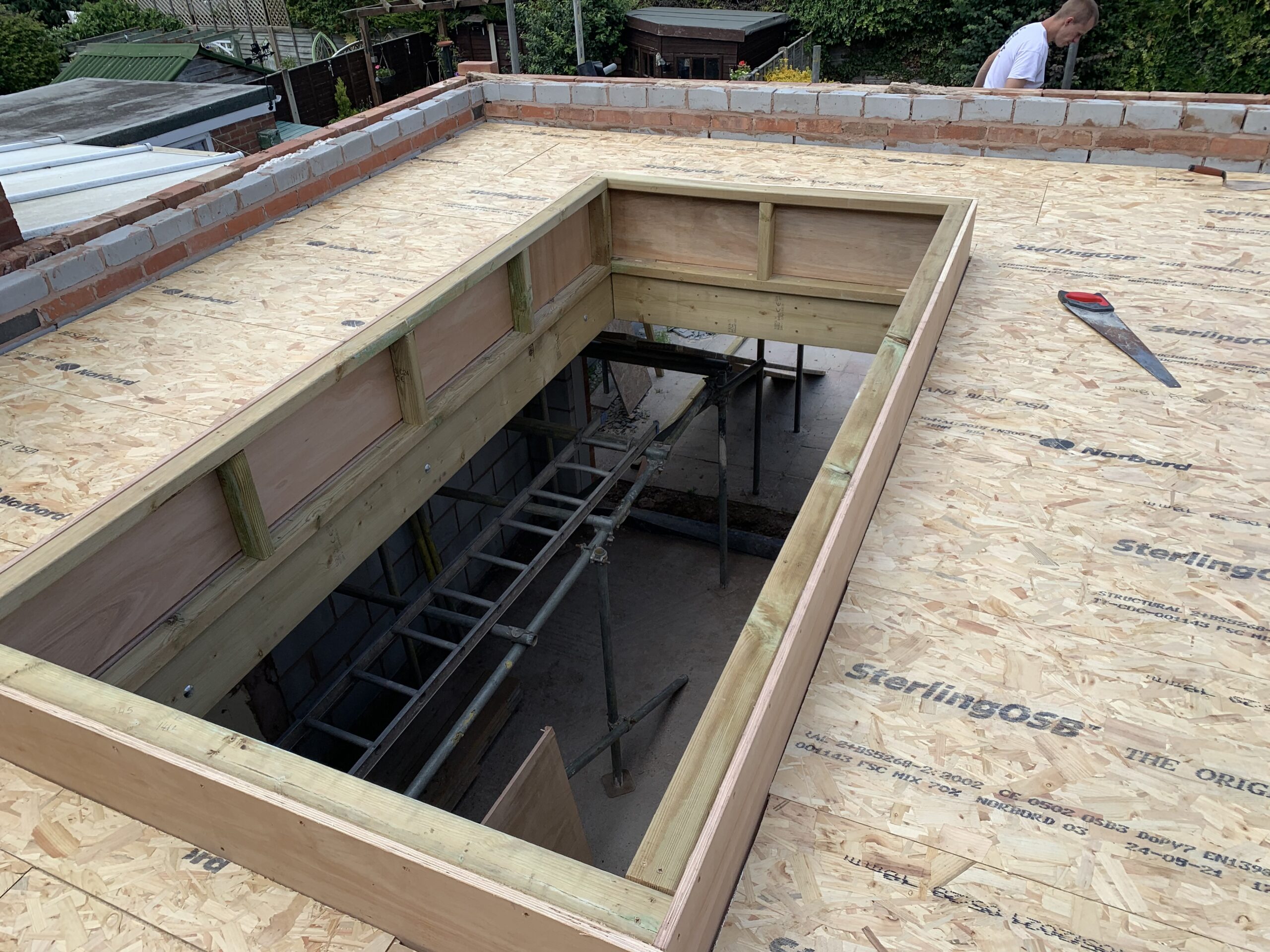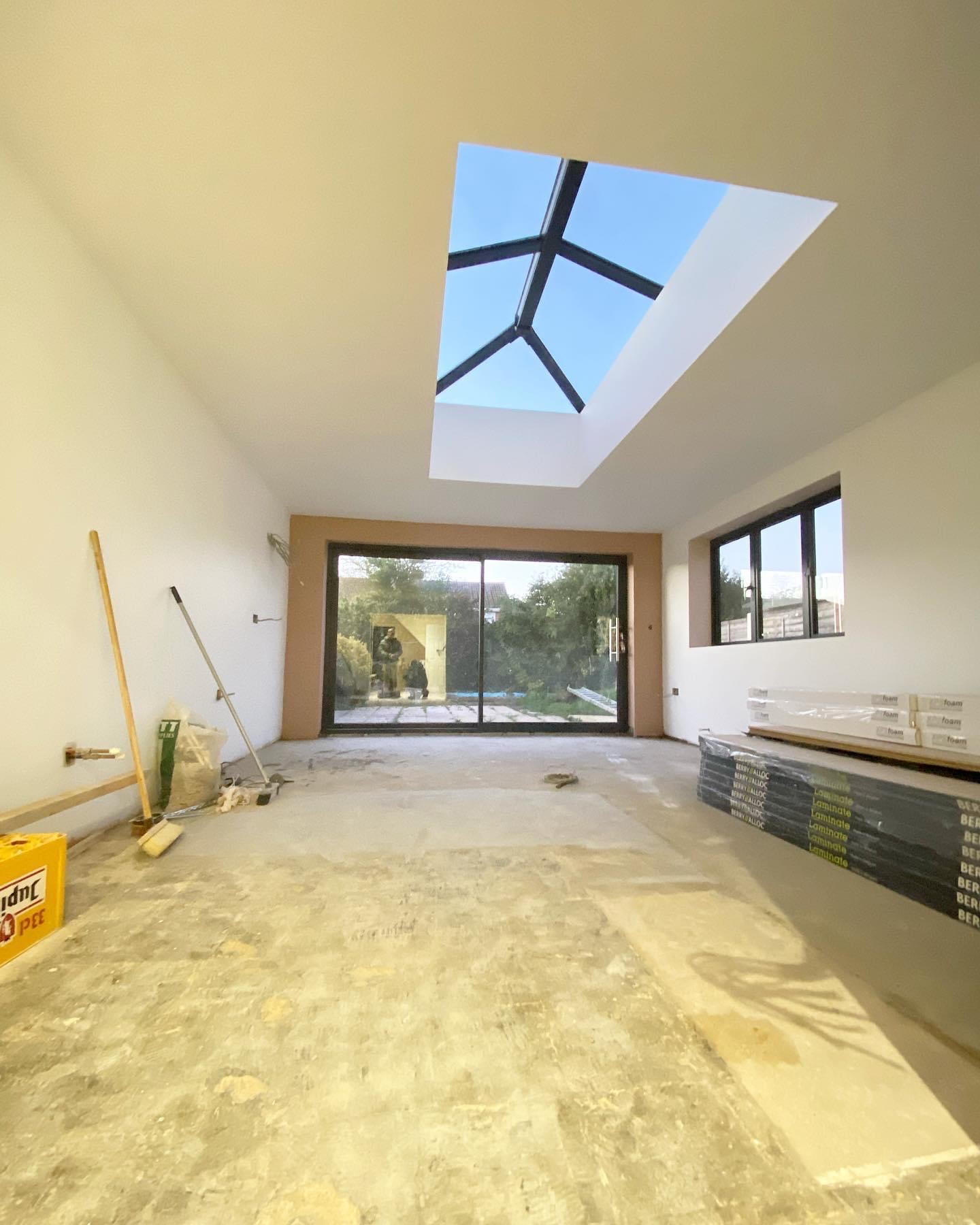 Extension in Mitton, Tewkesbury. Project was to knock down existing extension and rebuild a larger extension to increase the ground floor footprint. The extension incorporated a skylight for extra light over the open plan kitchen. The project was delivered ahead of time and on budget.