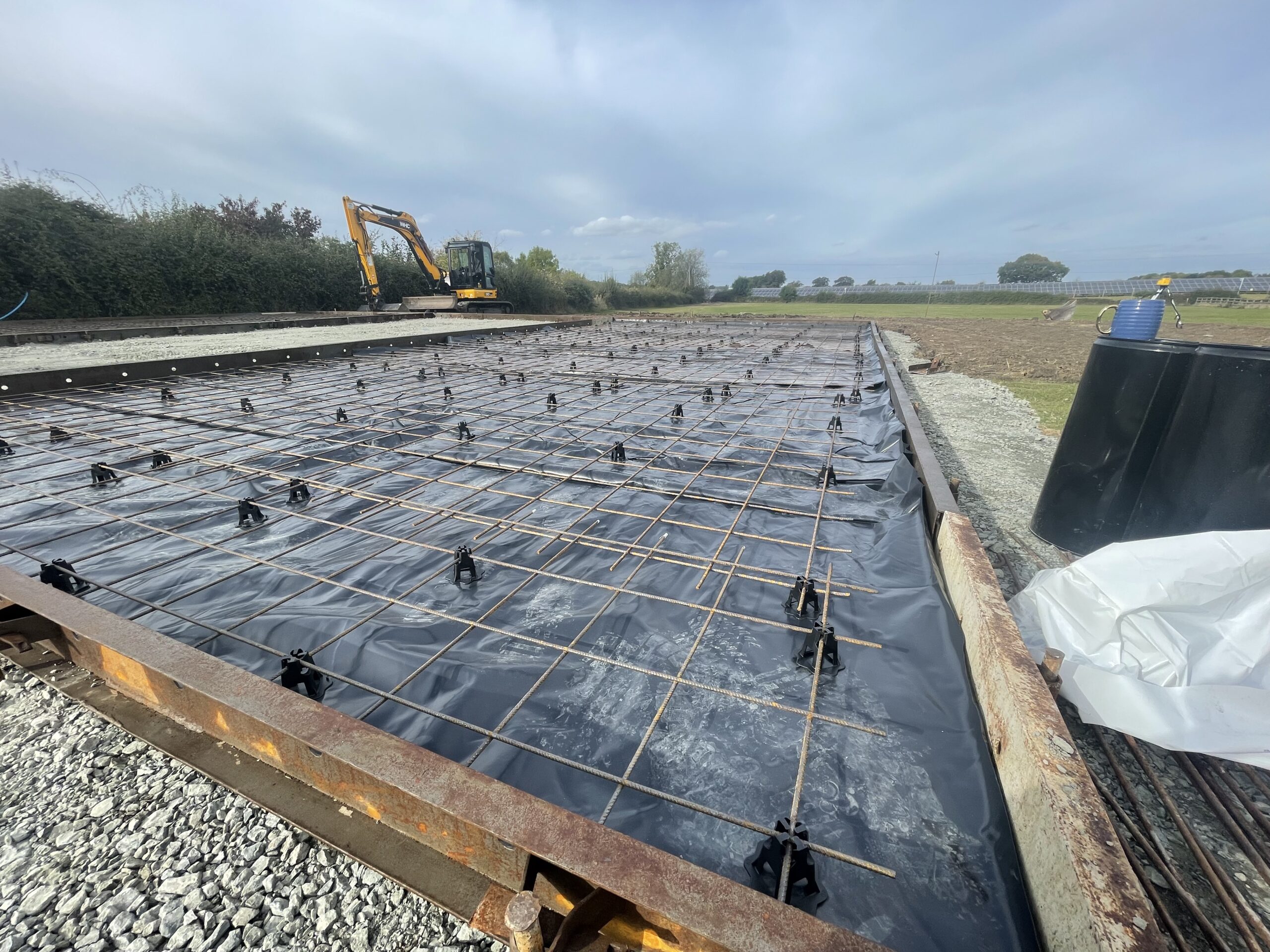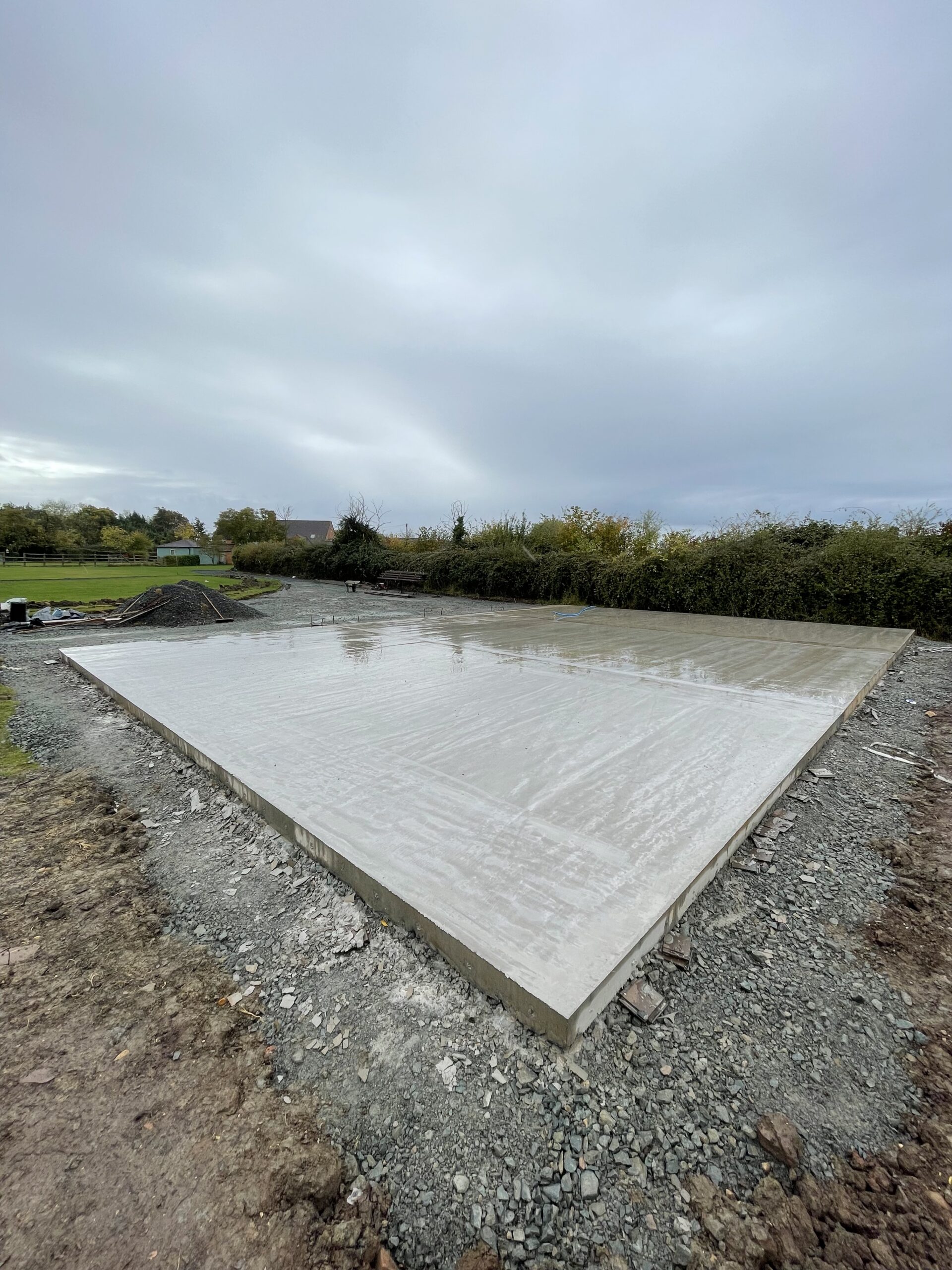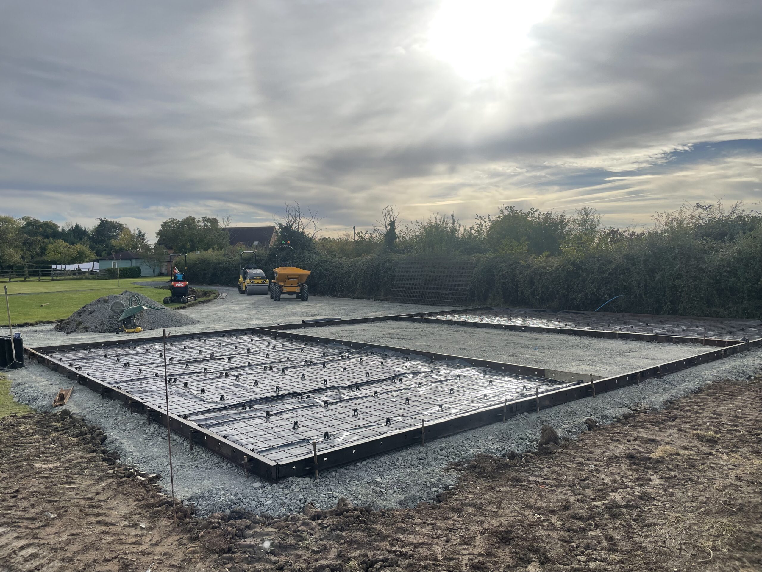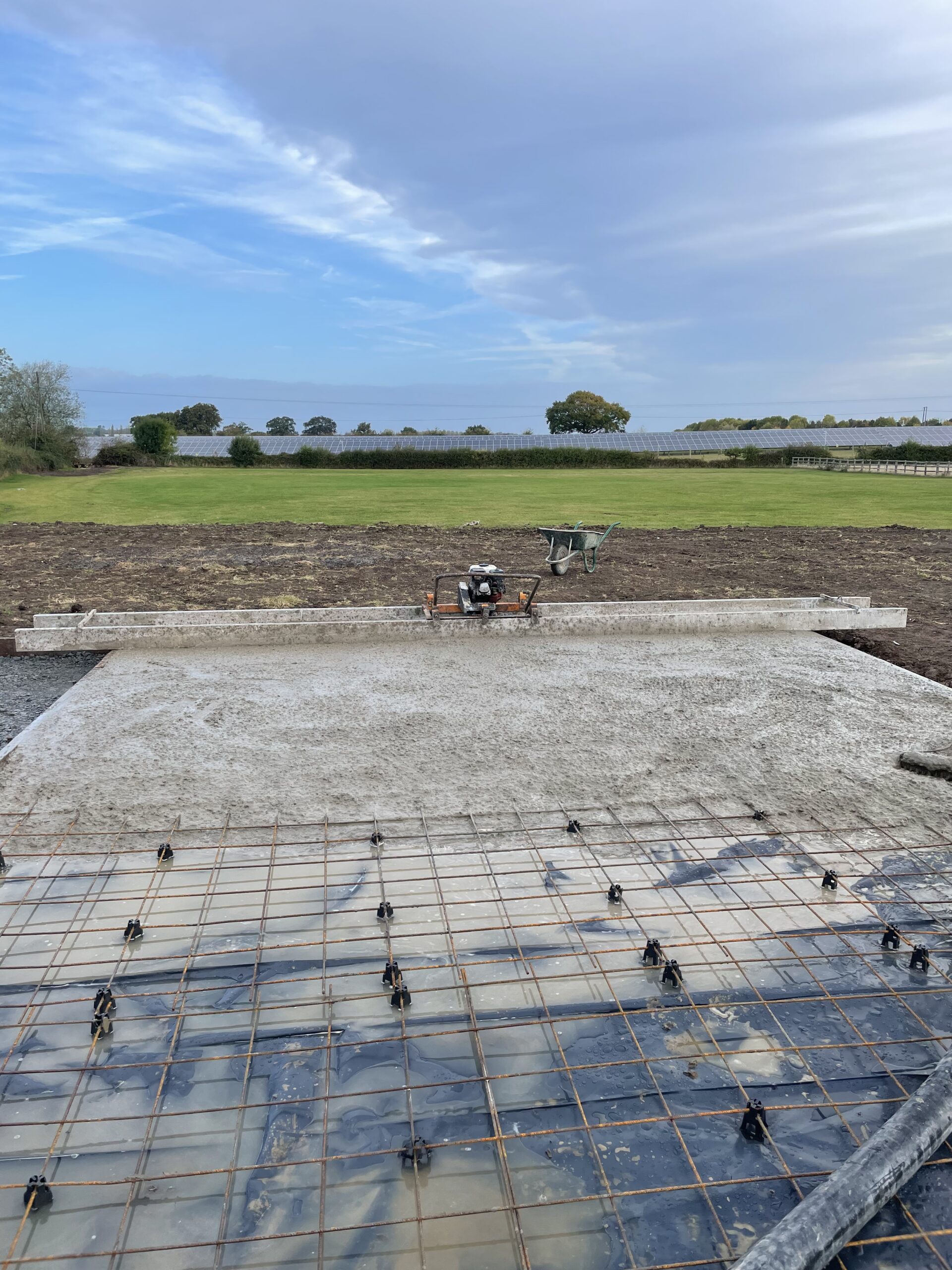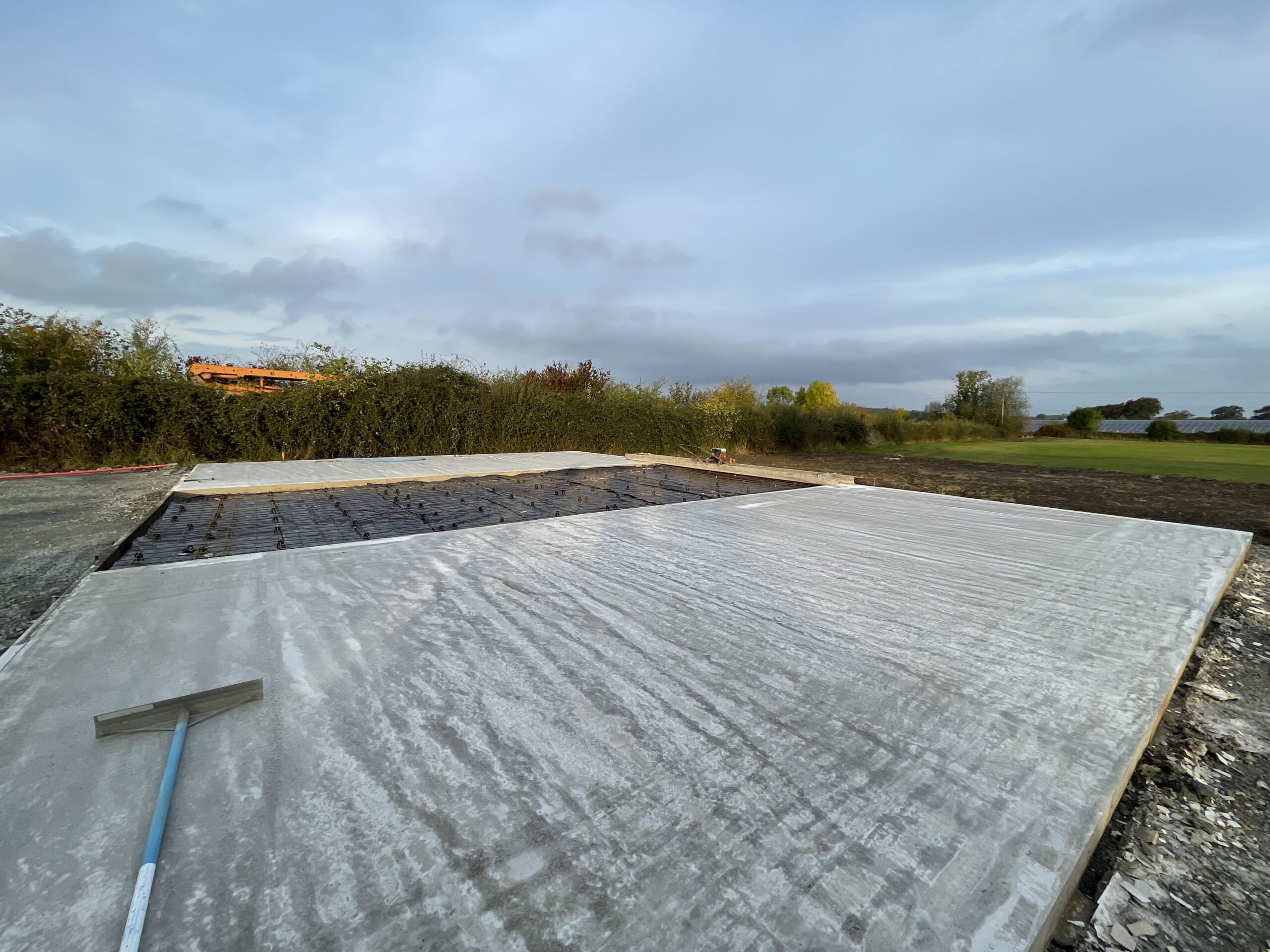 Wasted area transformed with a turning area and new road up to a newly installed steel framed building. Groundworks consisted of digging out and replacing with type 1 and compacted with a bomag. Formwork then installed in bays with road formers. Concrete was pumped in and laid with a power tamper and then a float finish. Steel framed building was erected by our team – a service which we do offer.