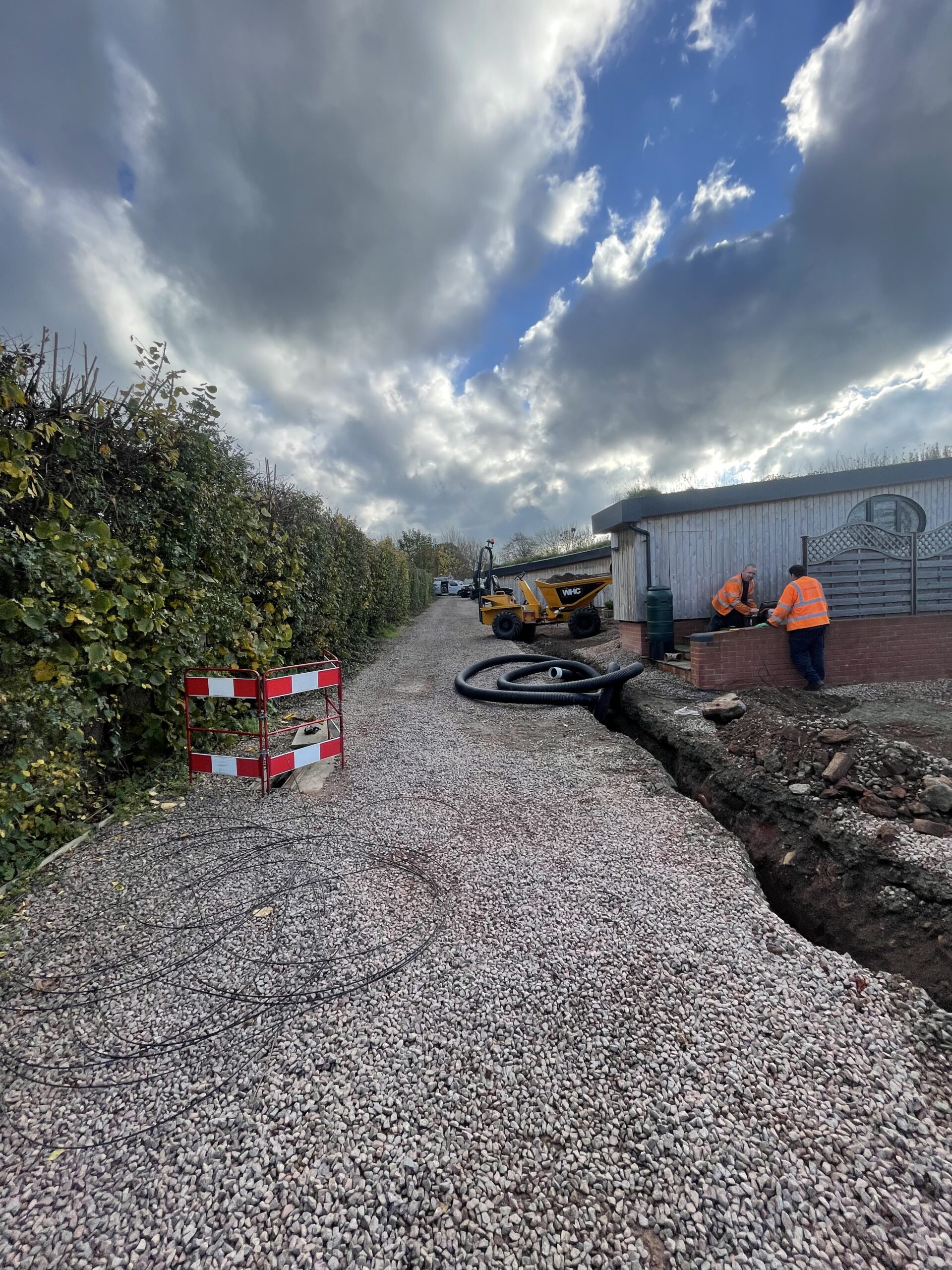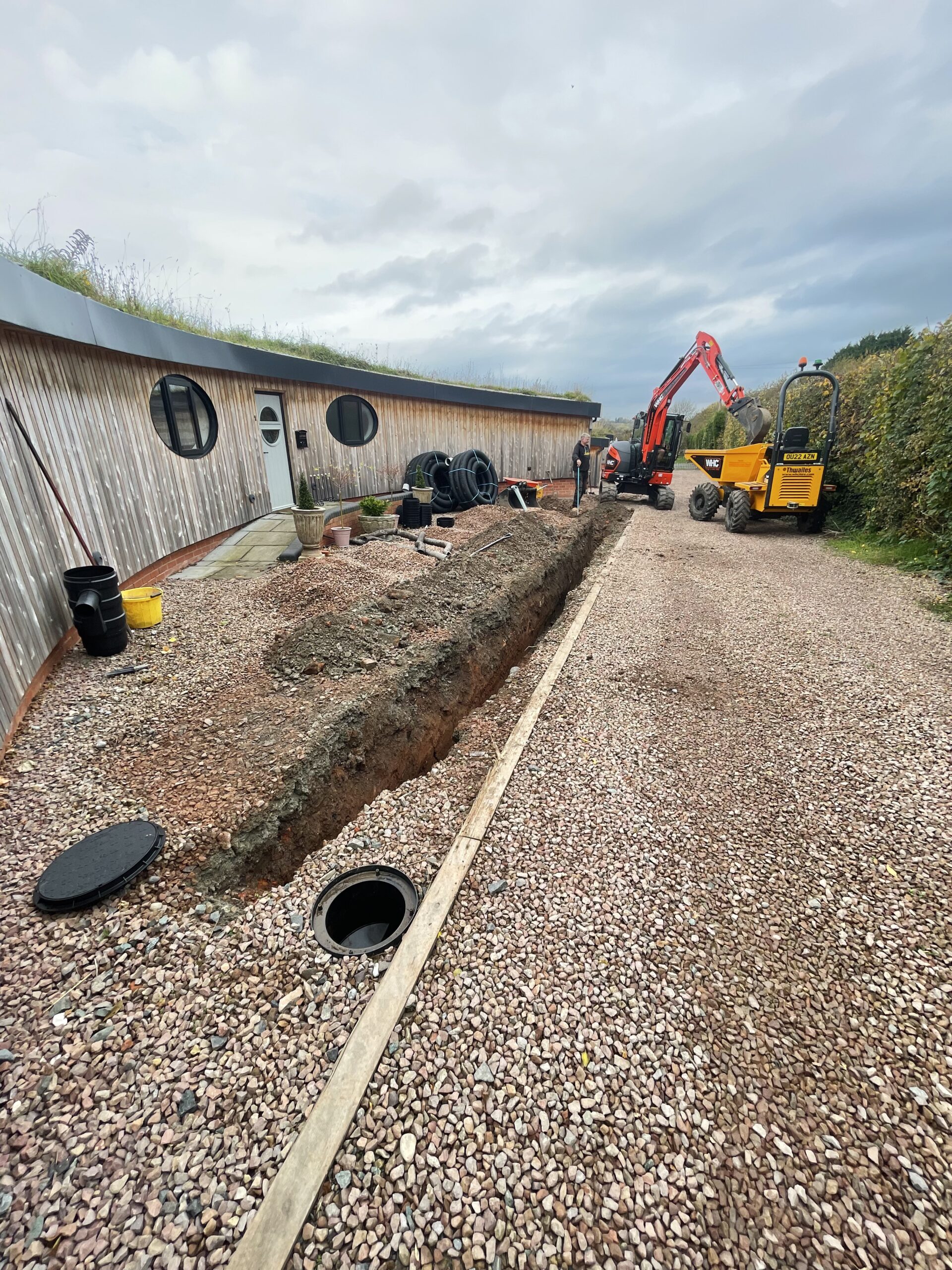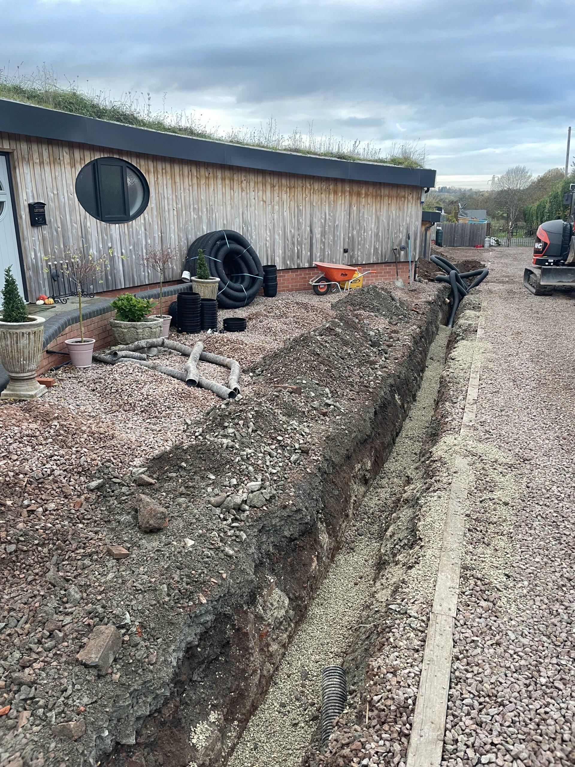 A remedial project which we took over in Northwick, Worcester. 4 inch storm water perforated pipe upgraded to 6 inch with silt traps and works to attenuation pond to meet regulations. Area was finished with new stone.