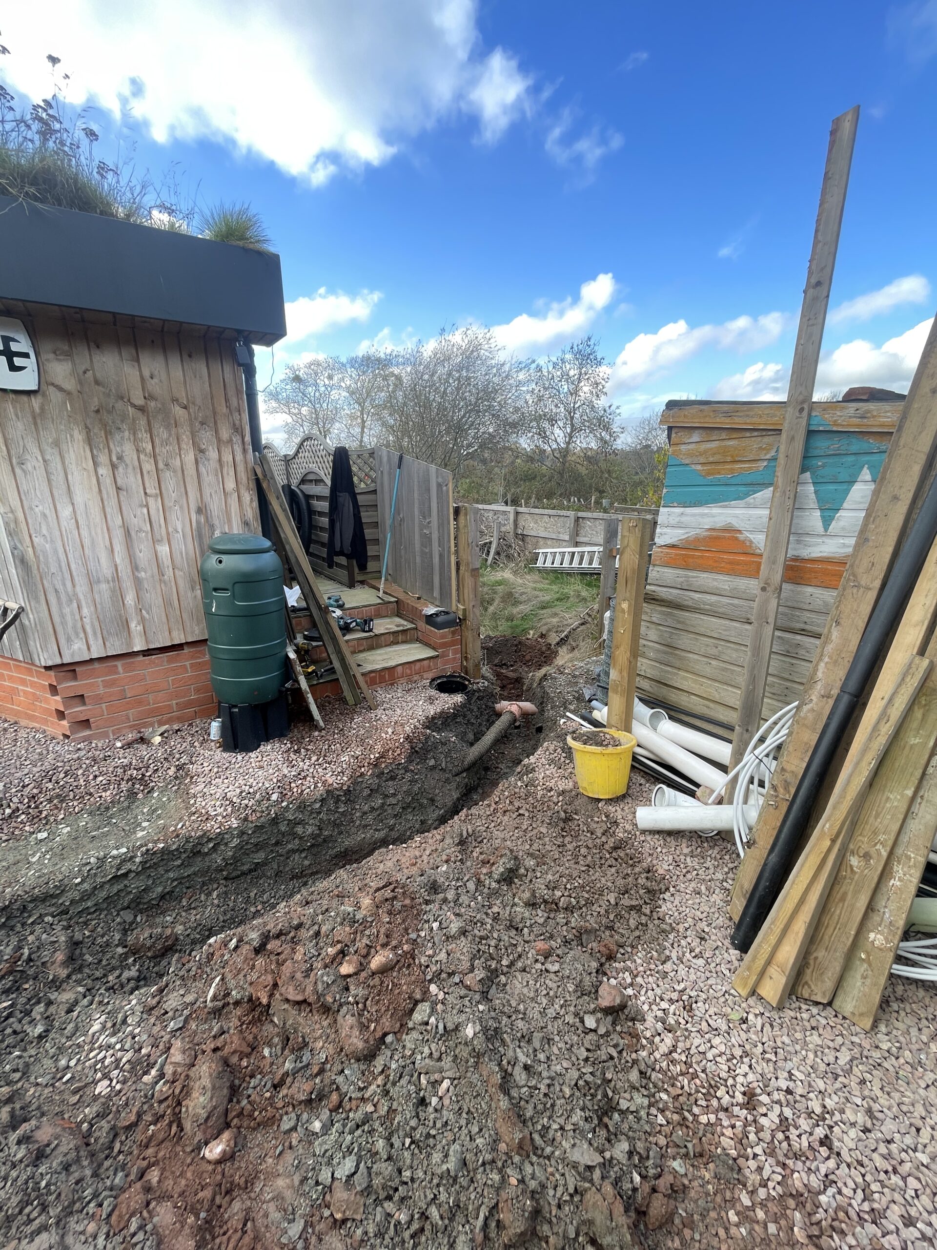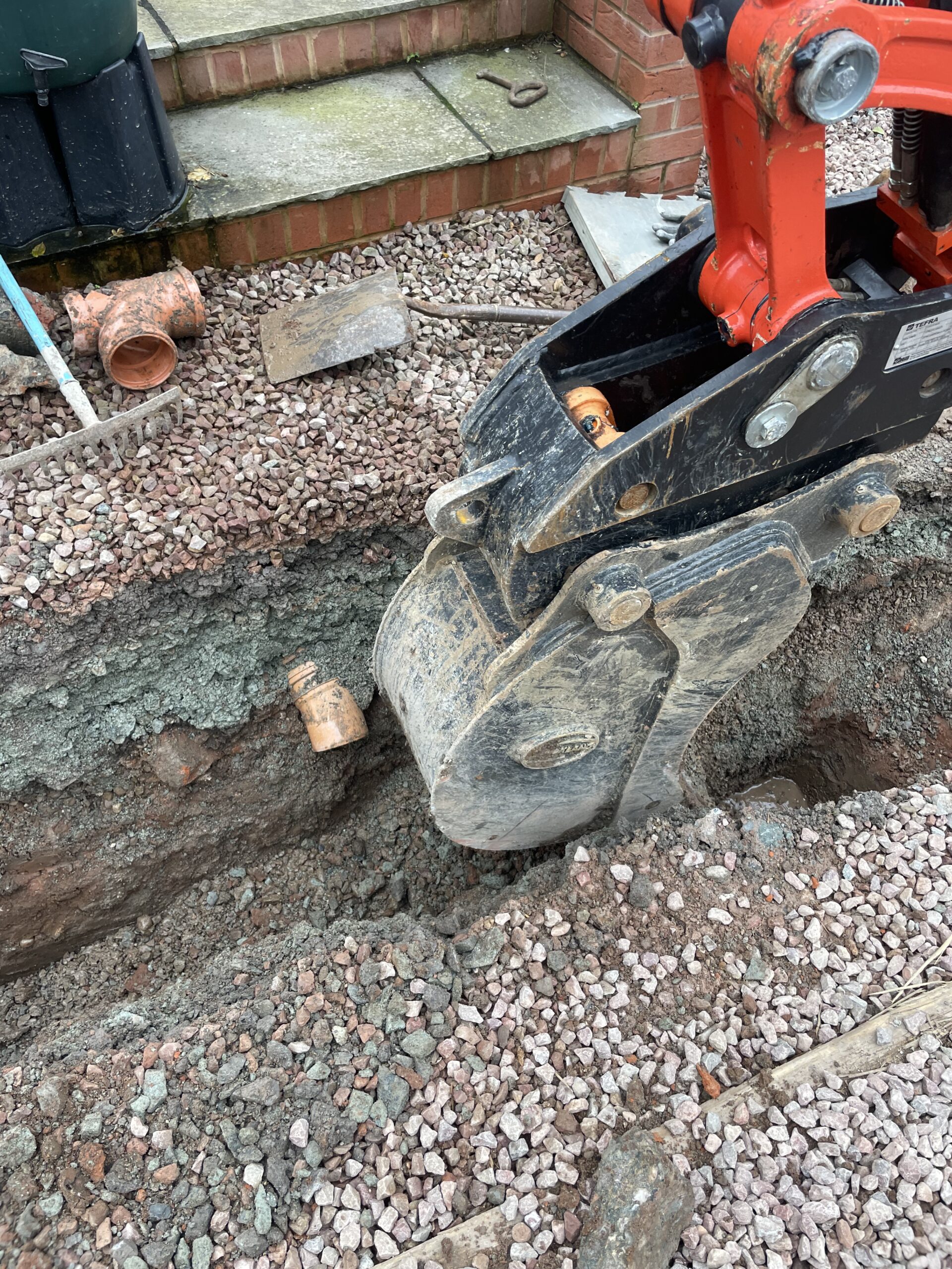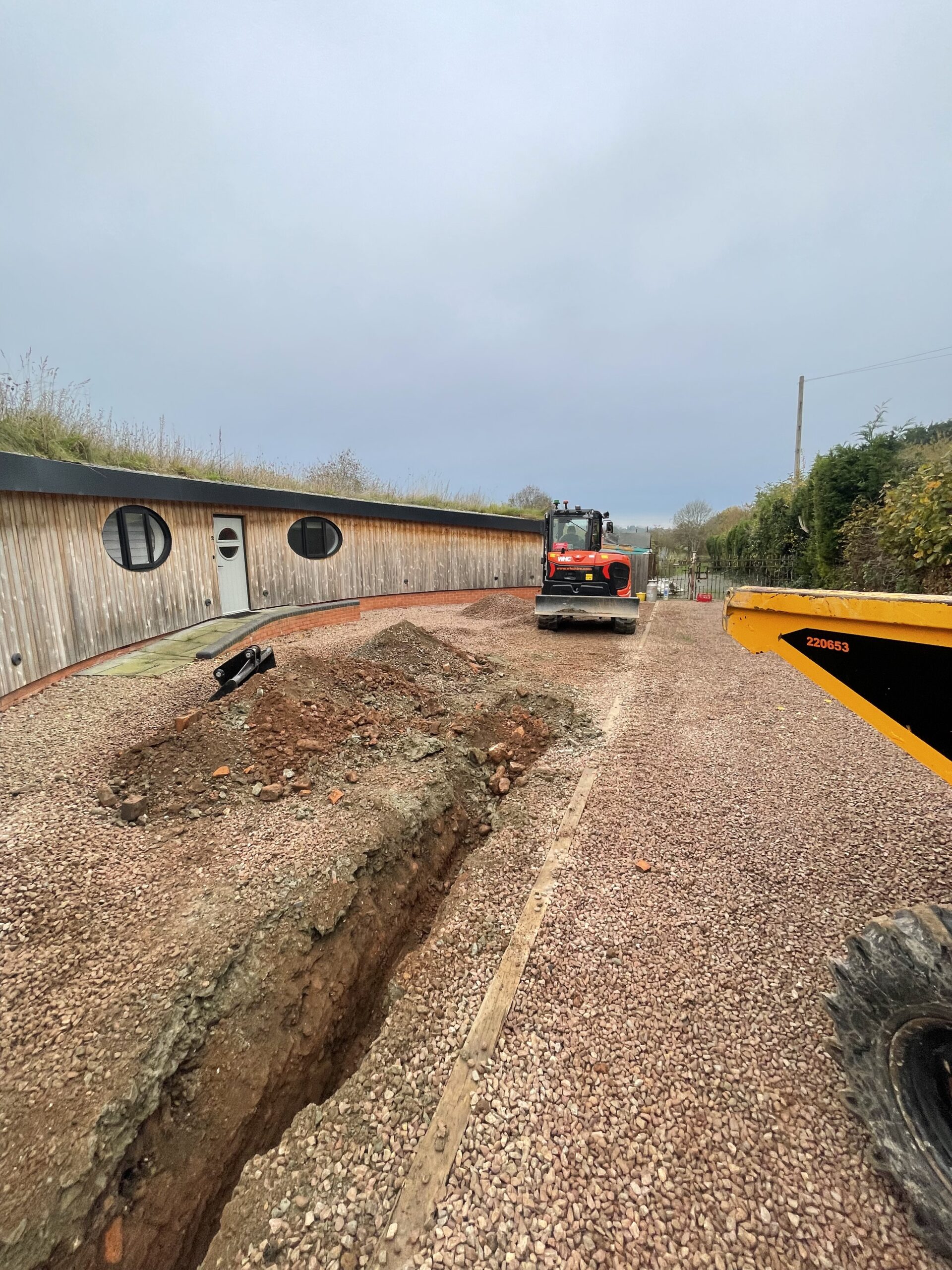 A remedial project which we took over in Northwick, Worcester. 4 inch storm water perforated pipe upgraded to 6 inch with silt traps and works to attenuation pond to meet regulations. Area was finished with new stone.