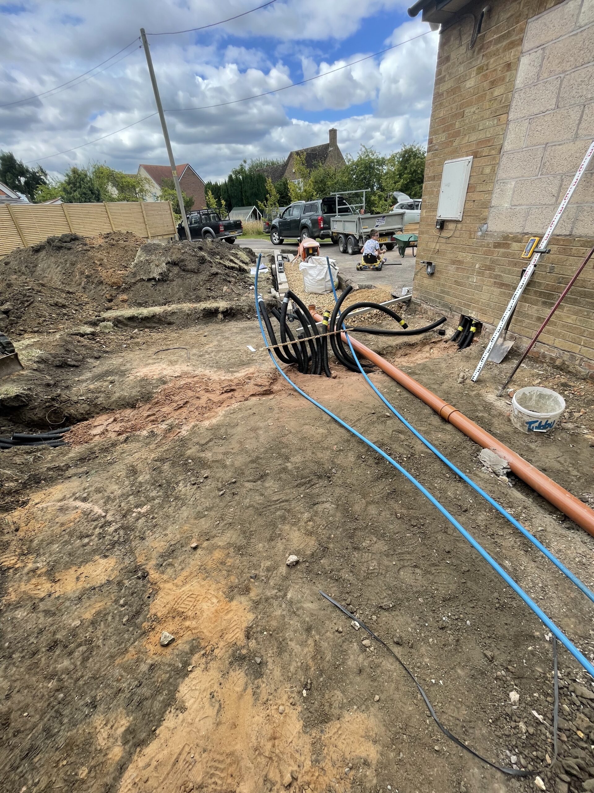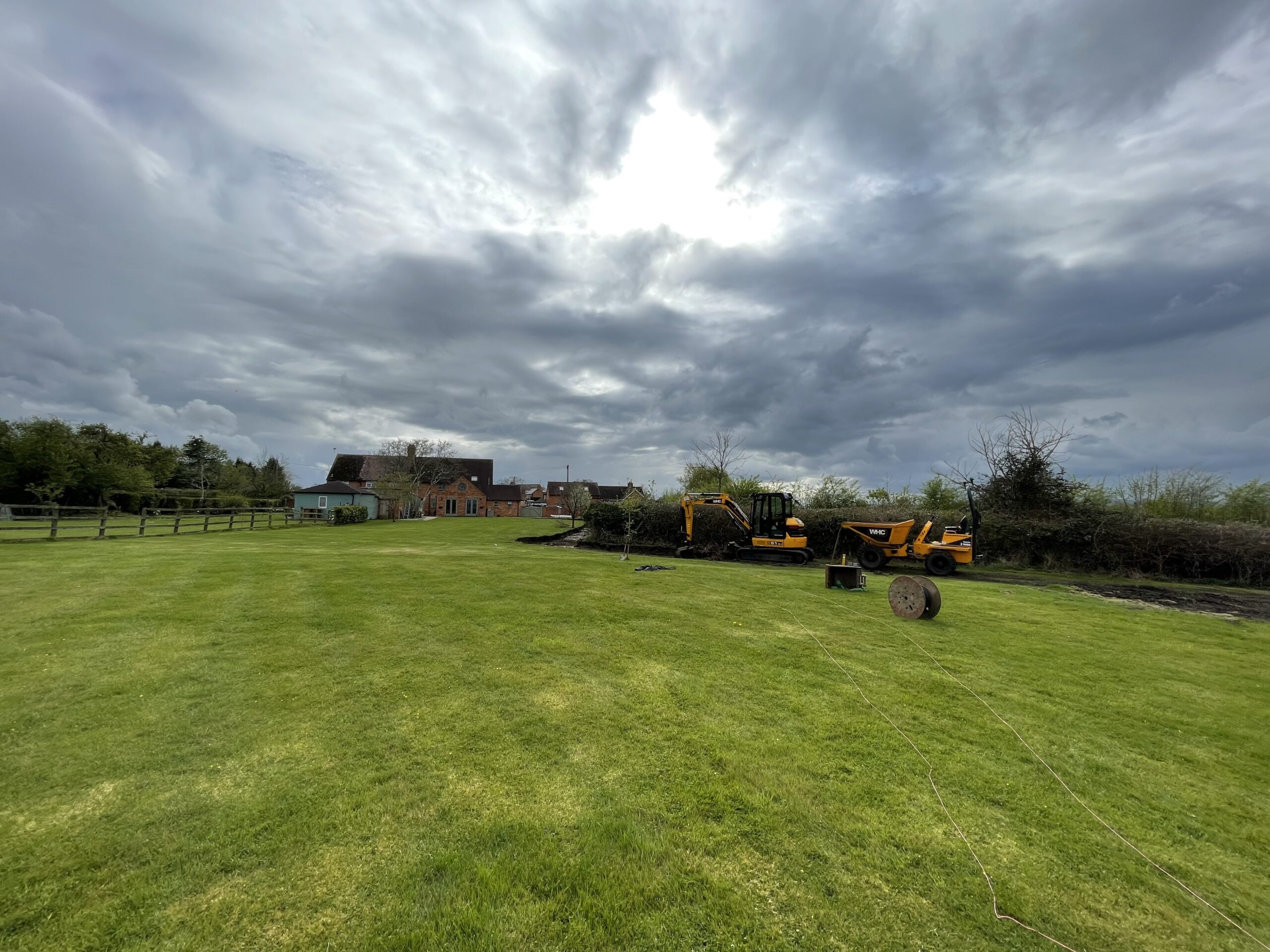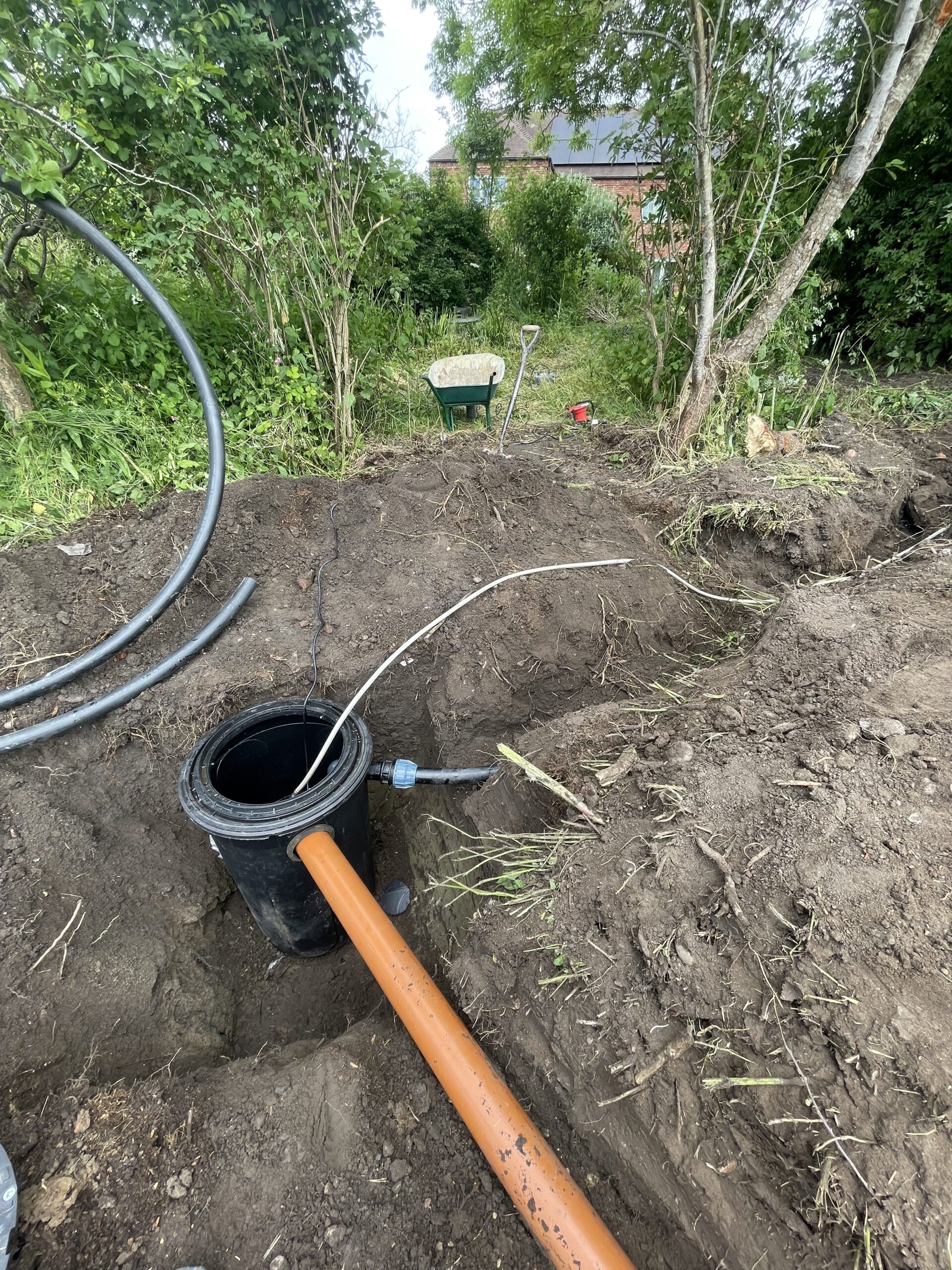 Originally, our customers in Bredon’s Hardwick were having a swimming pool installed in the large garden adjacent to the house. Unfortunately with poor ground conditions (running sand 1500mm below ground level) meant that it was not going to be practical for this property. Instead, plans were drawn up to utilise the space into a much more usable area. With this particular customer conscious of the environment we installed a 5000ltr rainwater harvesting tank to the rear of the timber framed building (built by the customer). We then ran a network of irrigation pipes to various points within the raised flower beds which the customer will use for watering their plants. Additonally, ducting was installed to allow electrical points to be added for a hot tub, garden lighting and power for their soon to be built garden bar.