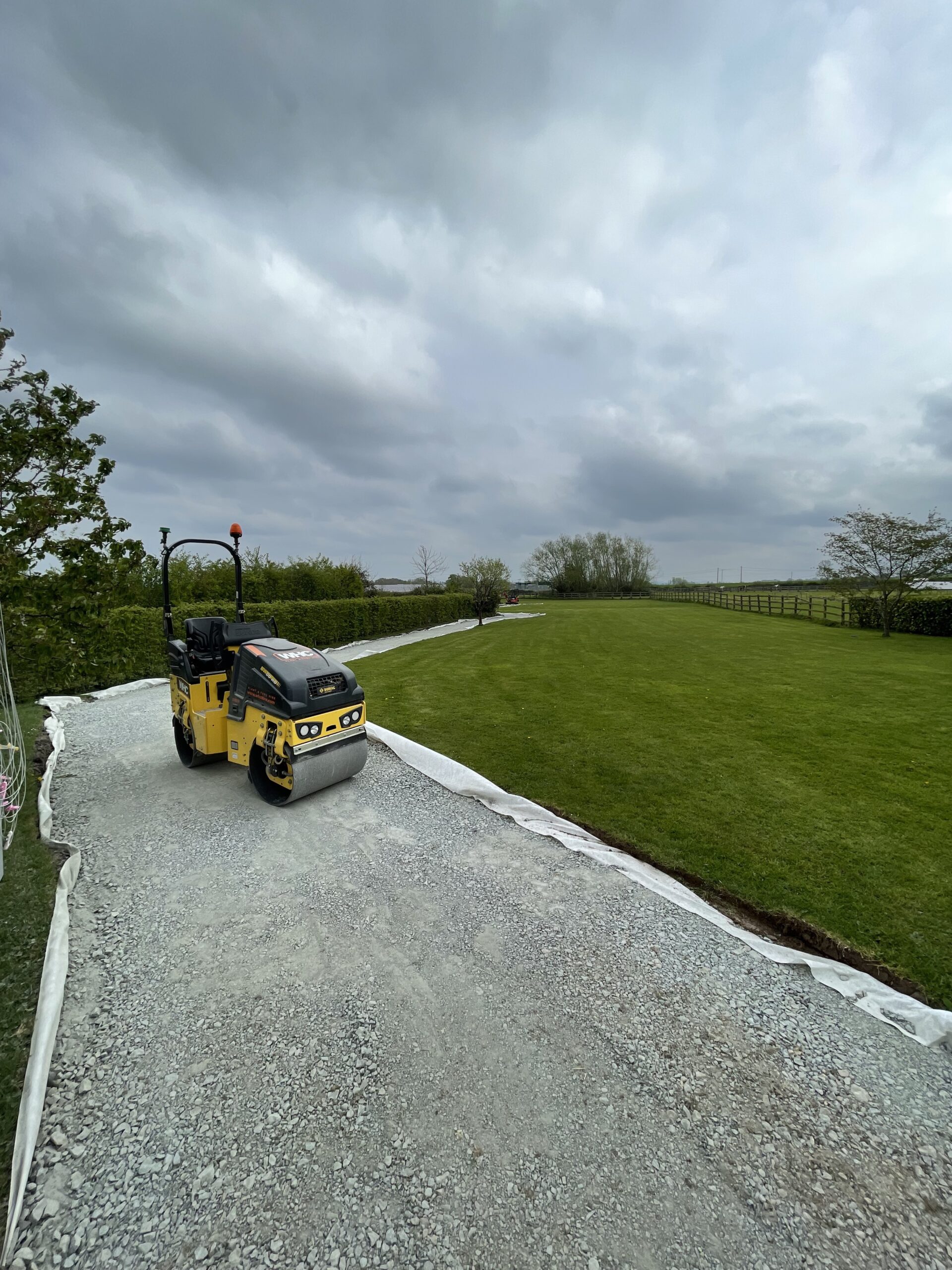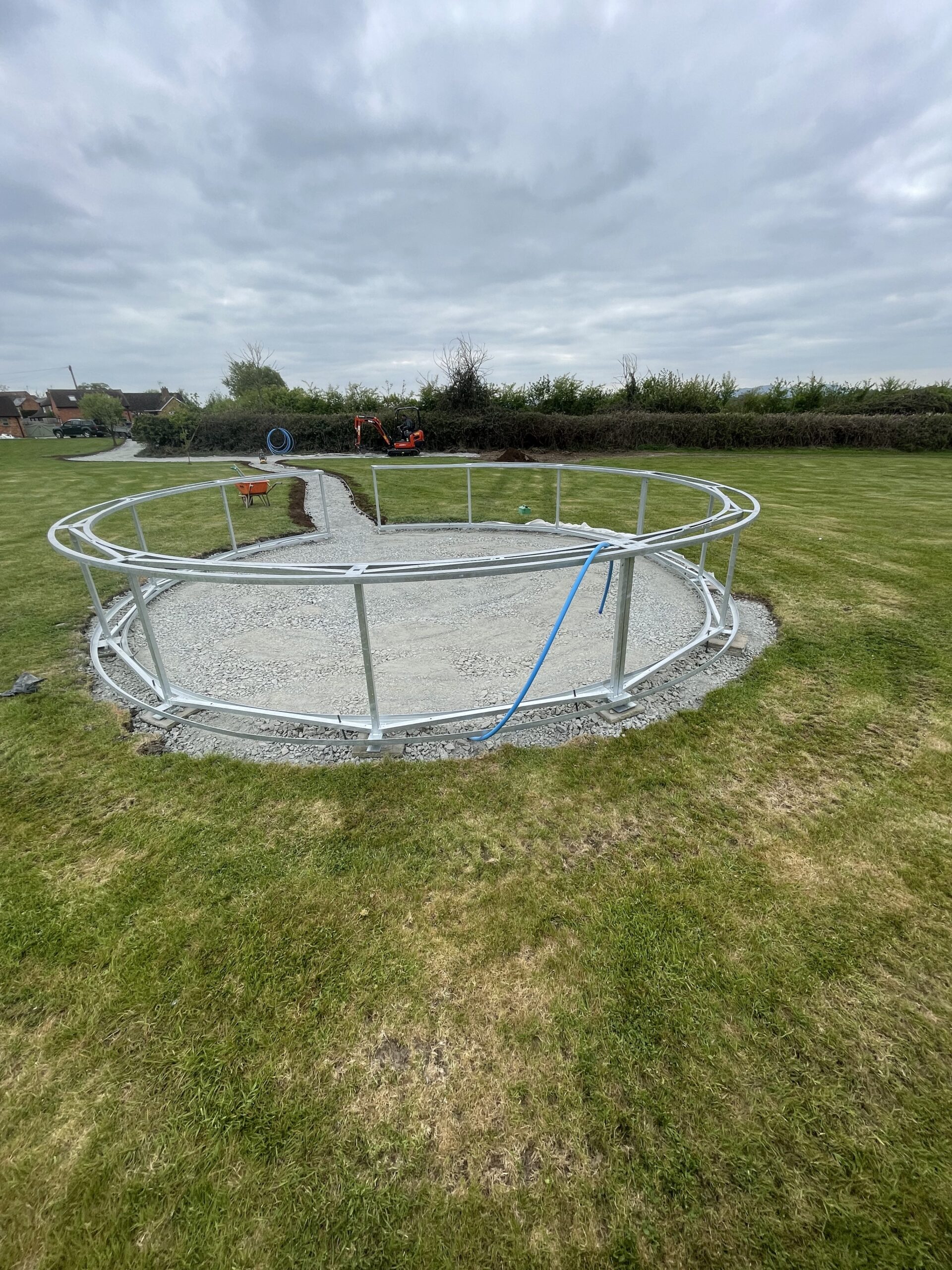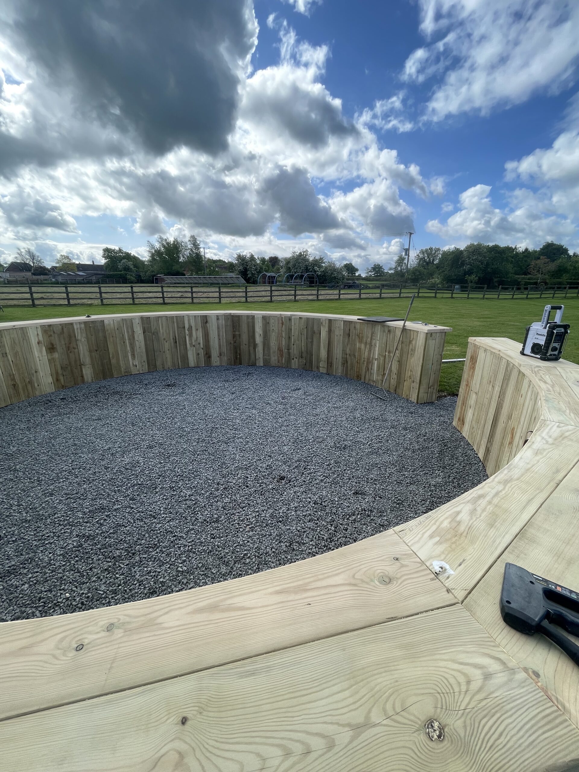 This project of installing a gravel road down the side of this customers garden which will lead to a steel cladded barn in the near future. A circle steel frame was installed with a walkway from the road which was cladded in timber. The idea behind the circle enclosure was that the customer could have a private area from overlooking neighbours. The road was dug out to a depth of 18 inches, layered with Terram and built up with type 2 stone. It was retained with a steel edging strip which was welded in situ to steel posts hidden in the stone. The stone was compacted with a Bomag before the final layer of suitable stone was laid.