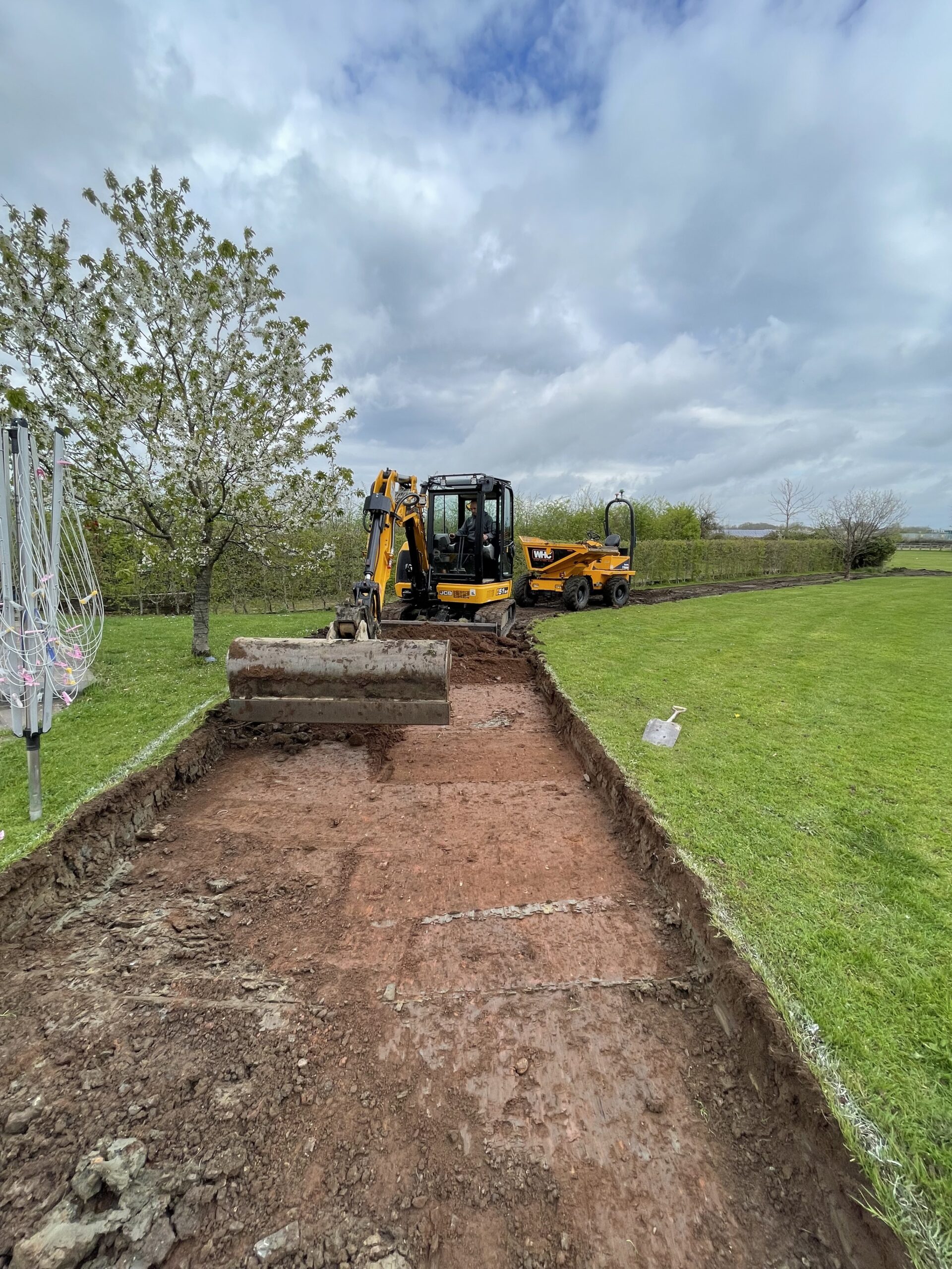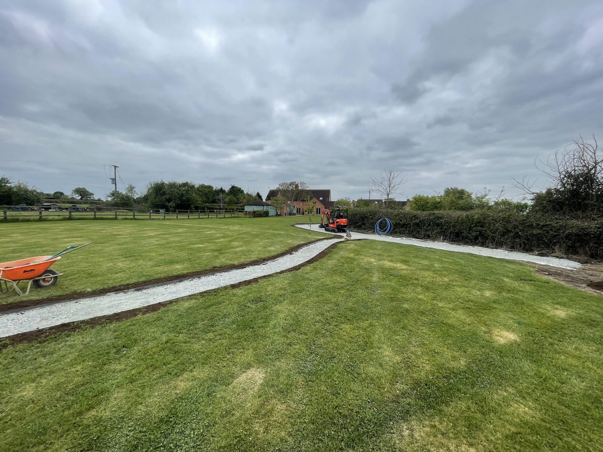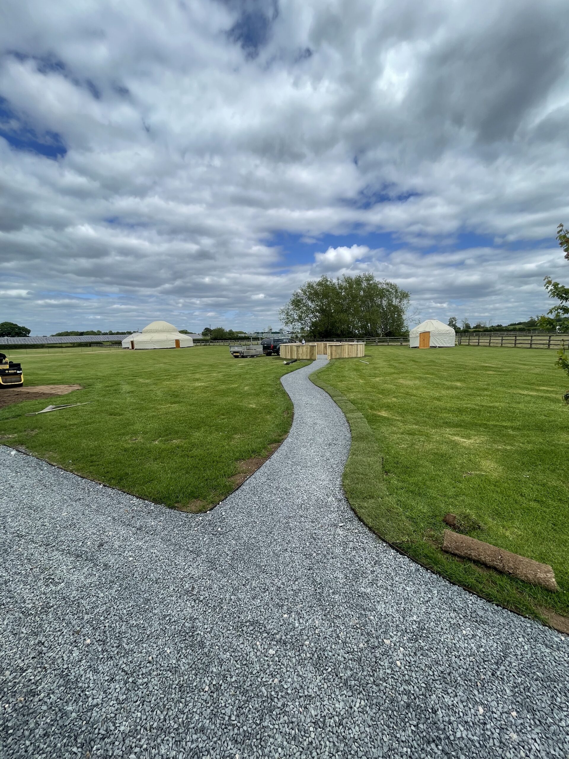 This project of installing a gravel road down the side of this customers garden which will lead to a steel cladded barn in the near future. A circle steel frame was installed with a walkway from the road which was cladded in timber. The idea behind the circle enclosure was that the customer could have a private area from overlooking neighbours. The road was dug out to a depth of 18 inches, layered with Terram and built up with type 2 stone. It was retained with a steel edging strip which was welded in situ to steel posts hidden in the stone. The stone was compacted with a Bomag before the final layer of suitable stone was laid.