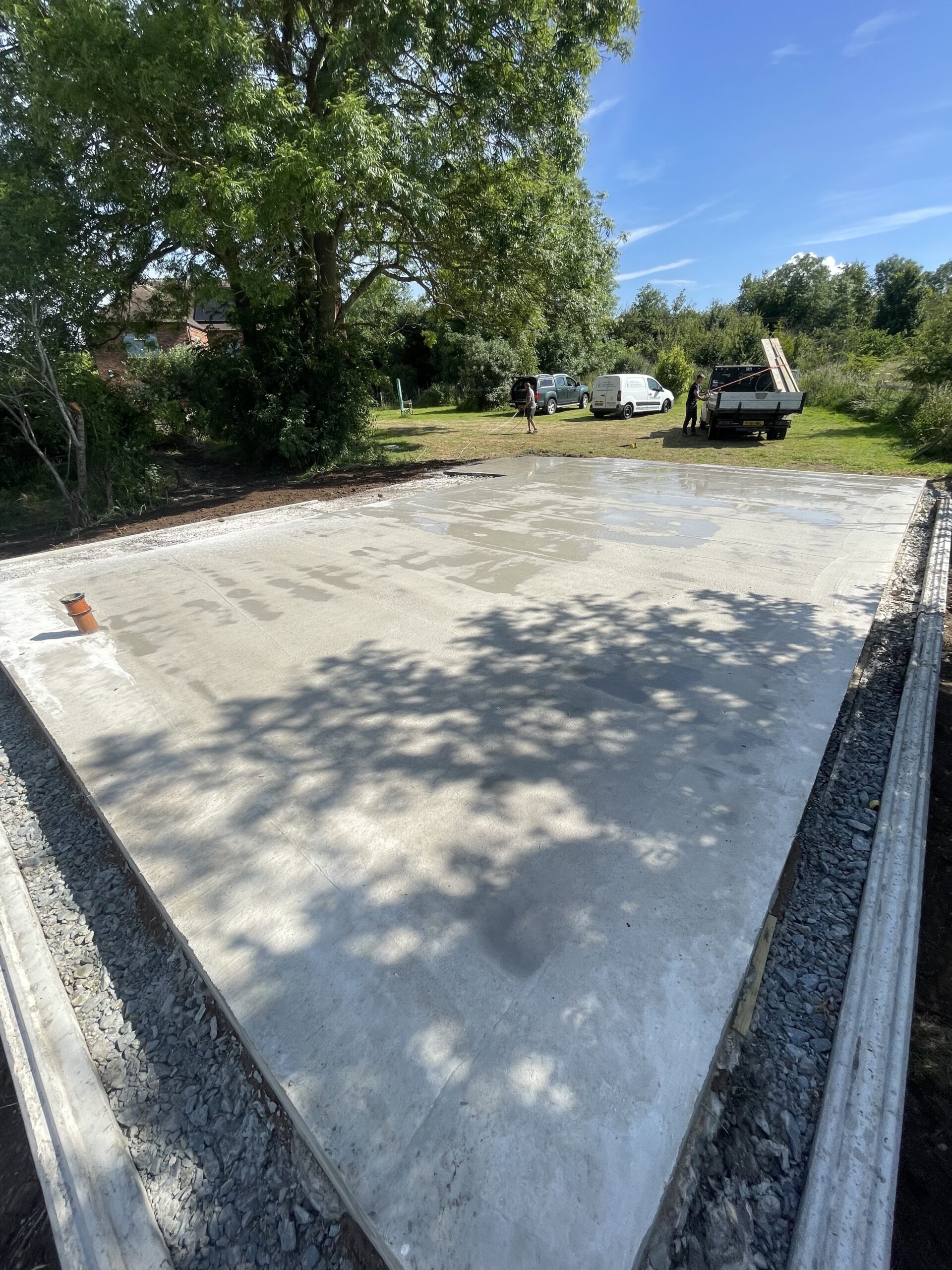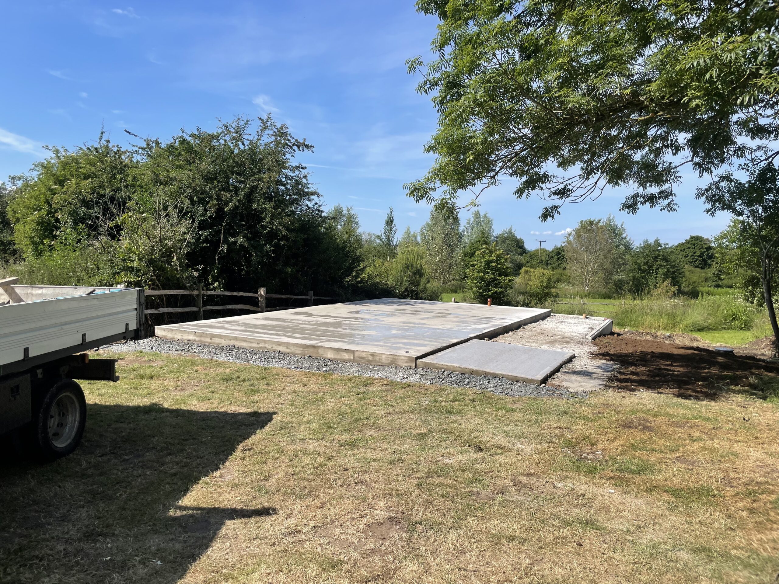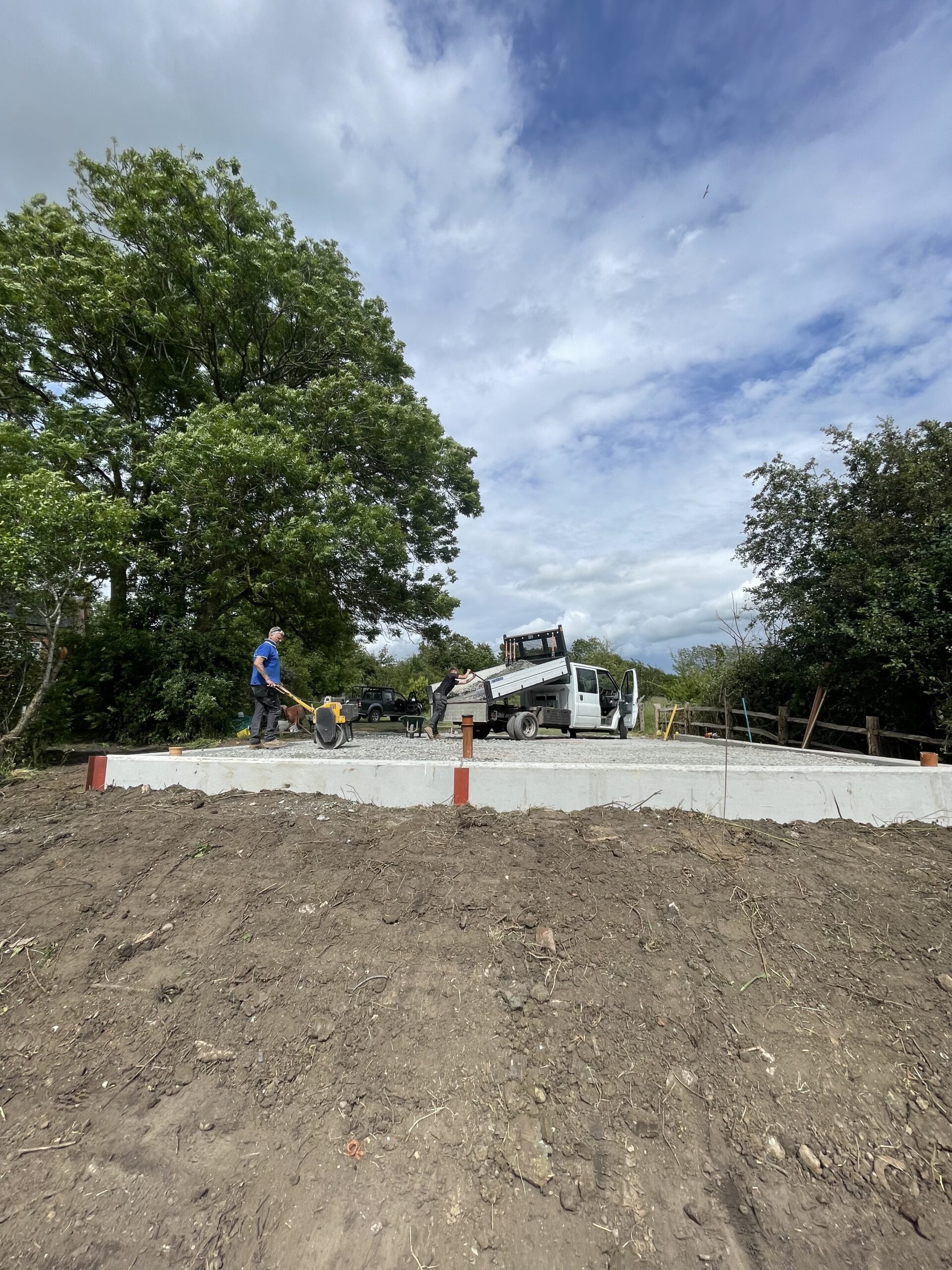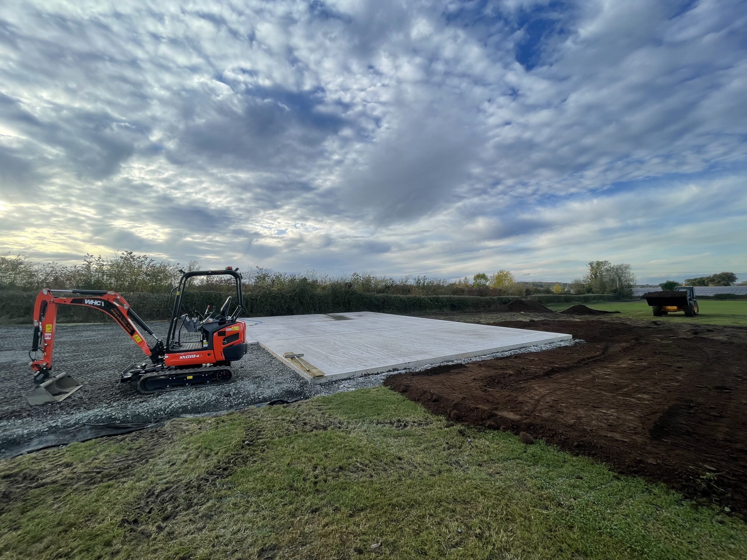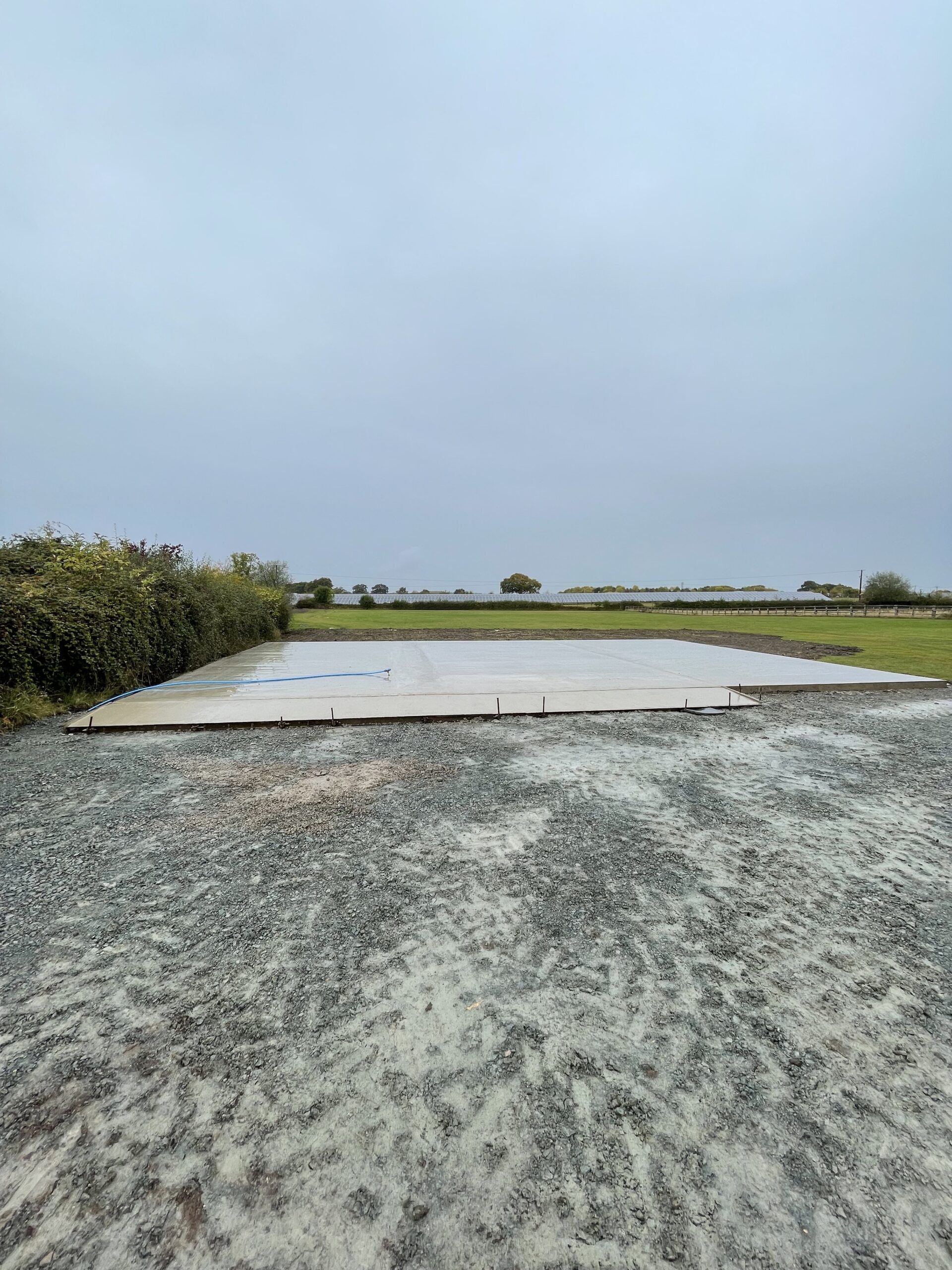 The project was to build a concrete pad for a new steel framed building which will be used for storing vehicles and machinery. We dug out over 100 tonnes of soil, laid membrane, stoned up with 10 inches of type 1 and then formed shuttering with concrete shuttering panels to the exact dimensions of the building.