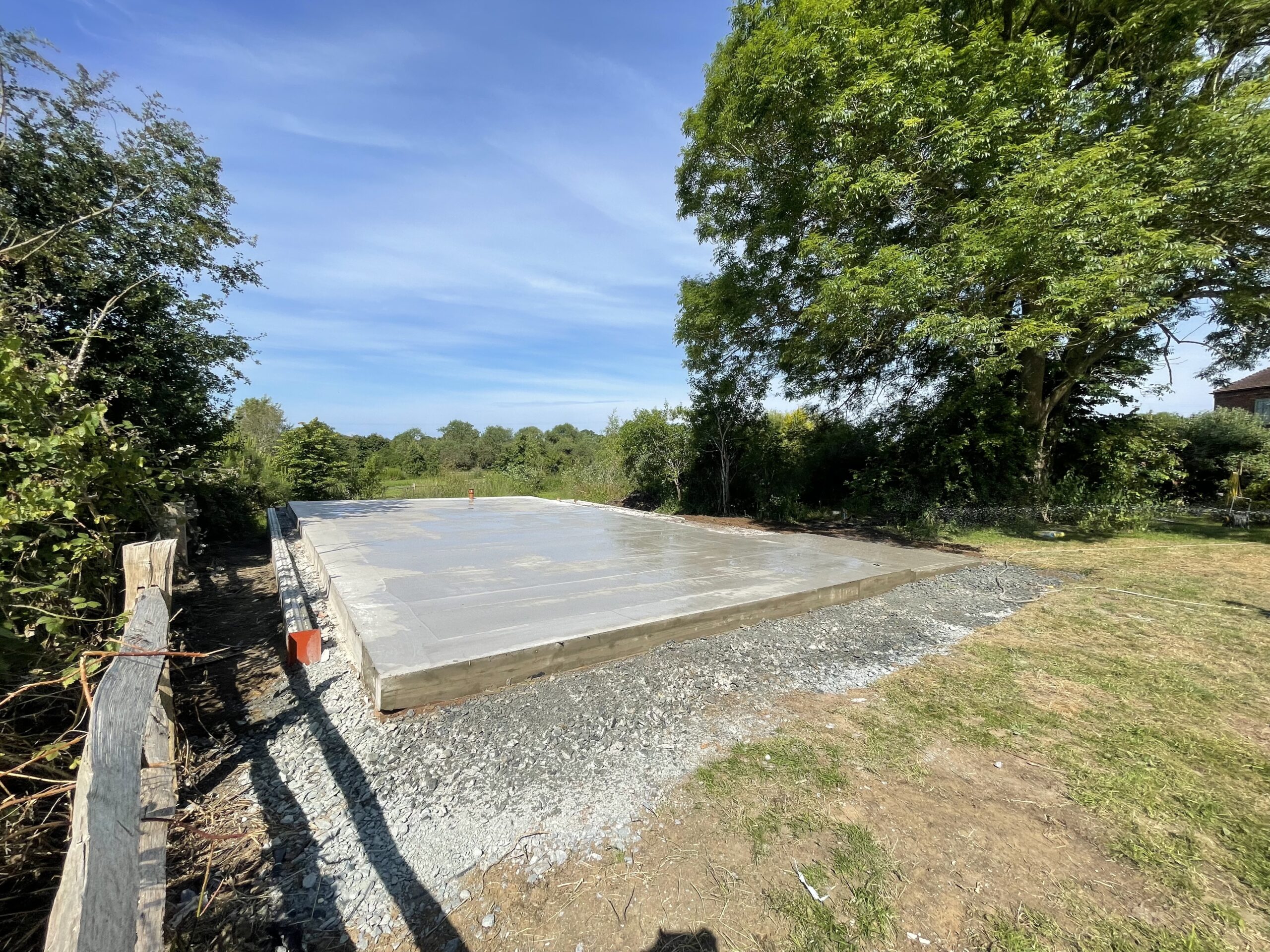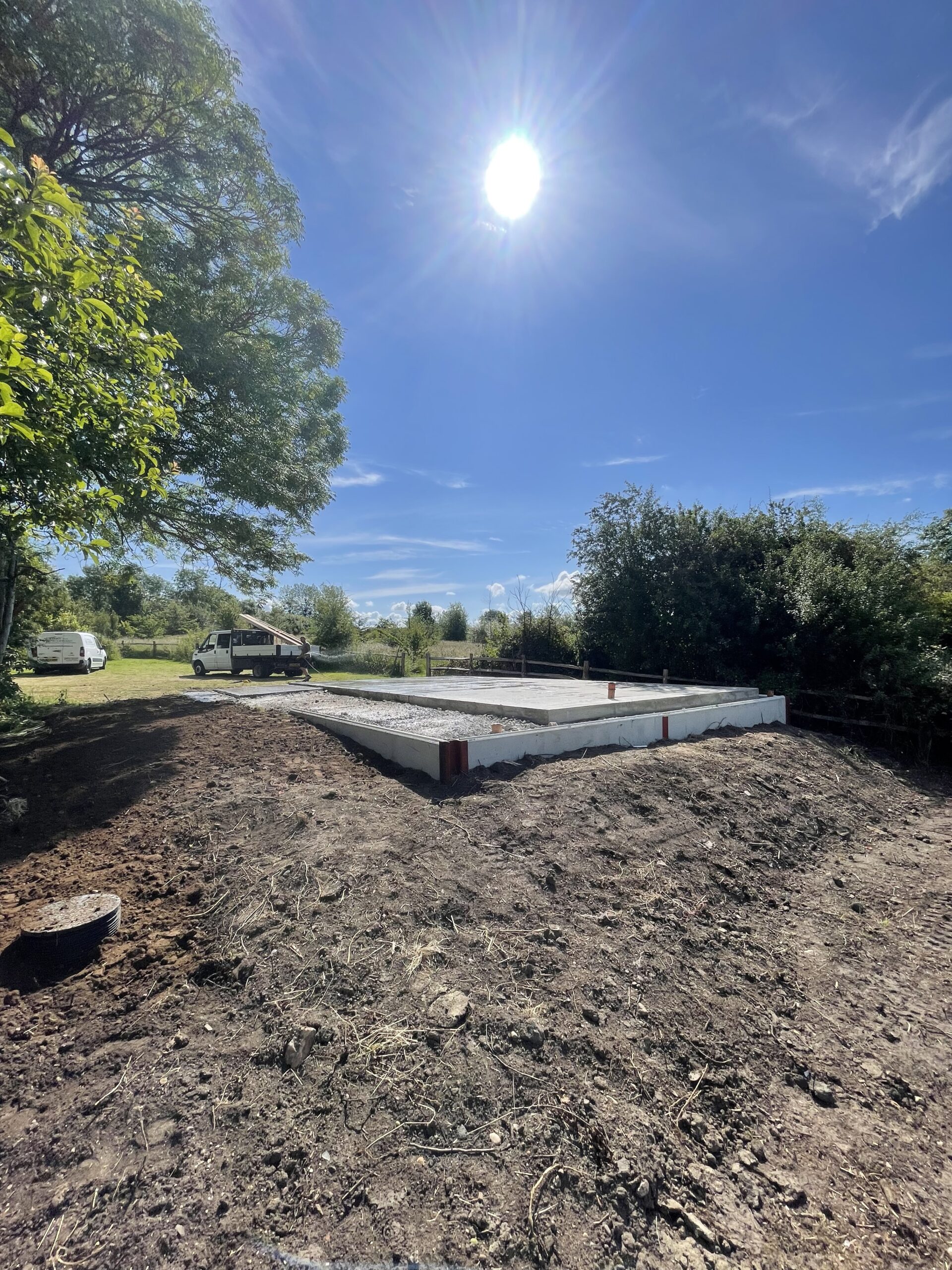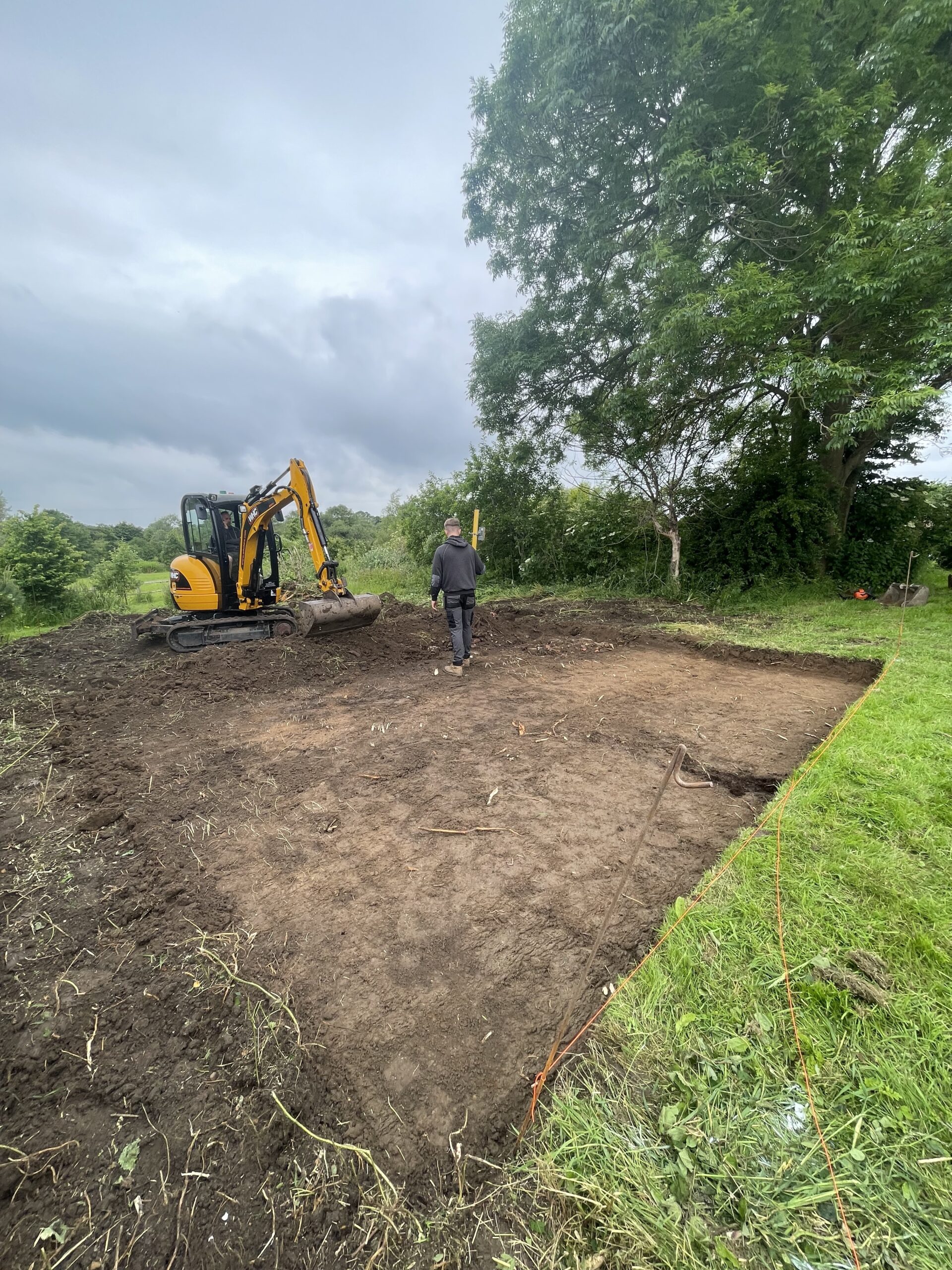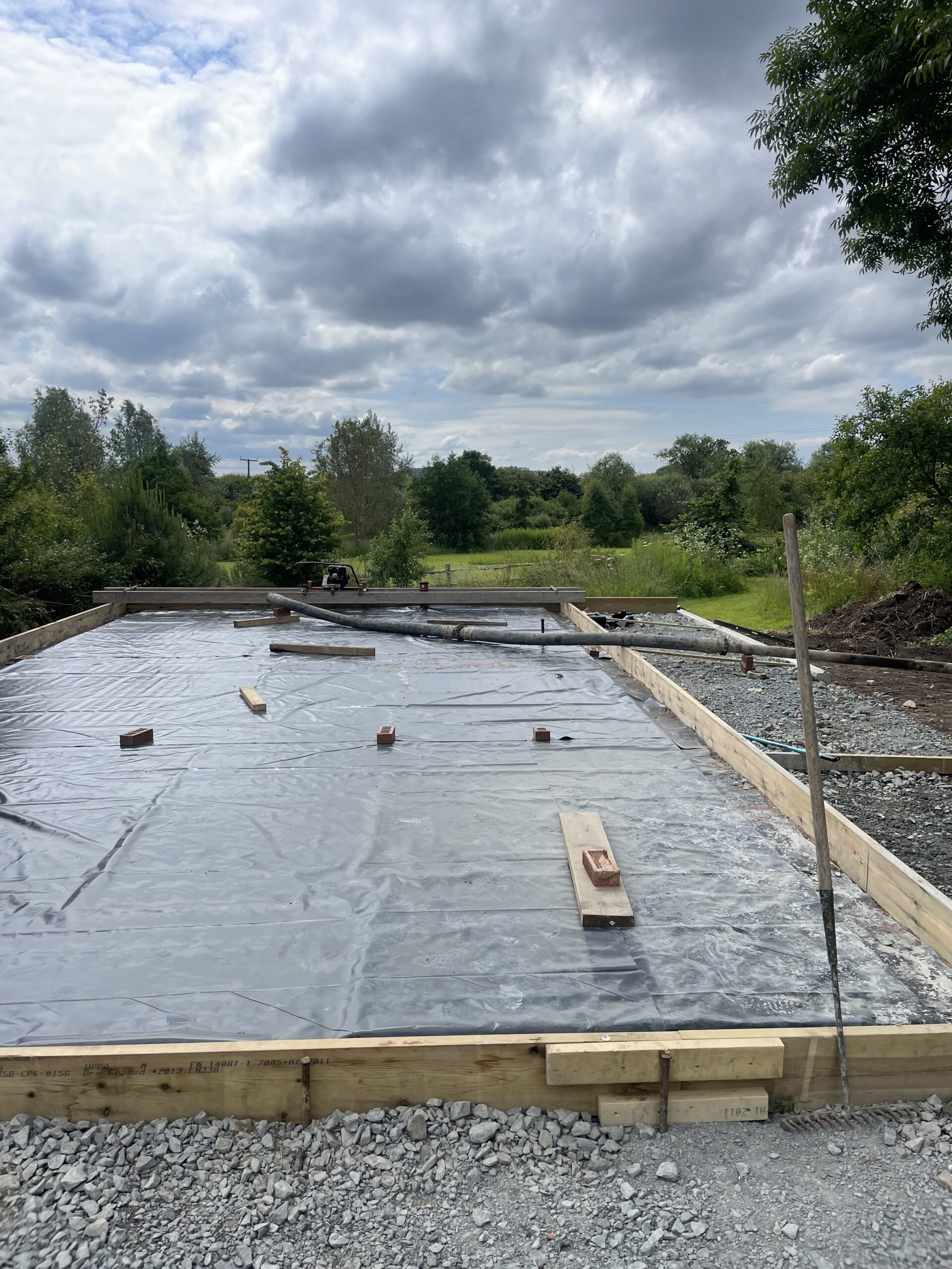 The project was to build a concrete pad for a new steel framed building which will be used for storing vehicles and machinery. We dug out over 100 tonnes of soil, laid membrane, stoned up with 10 inches of type 1 and then formed shuttering with concrete shuttering panels to the exact dimensions of the building.