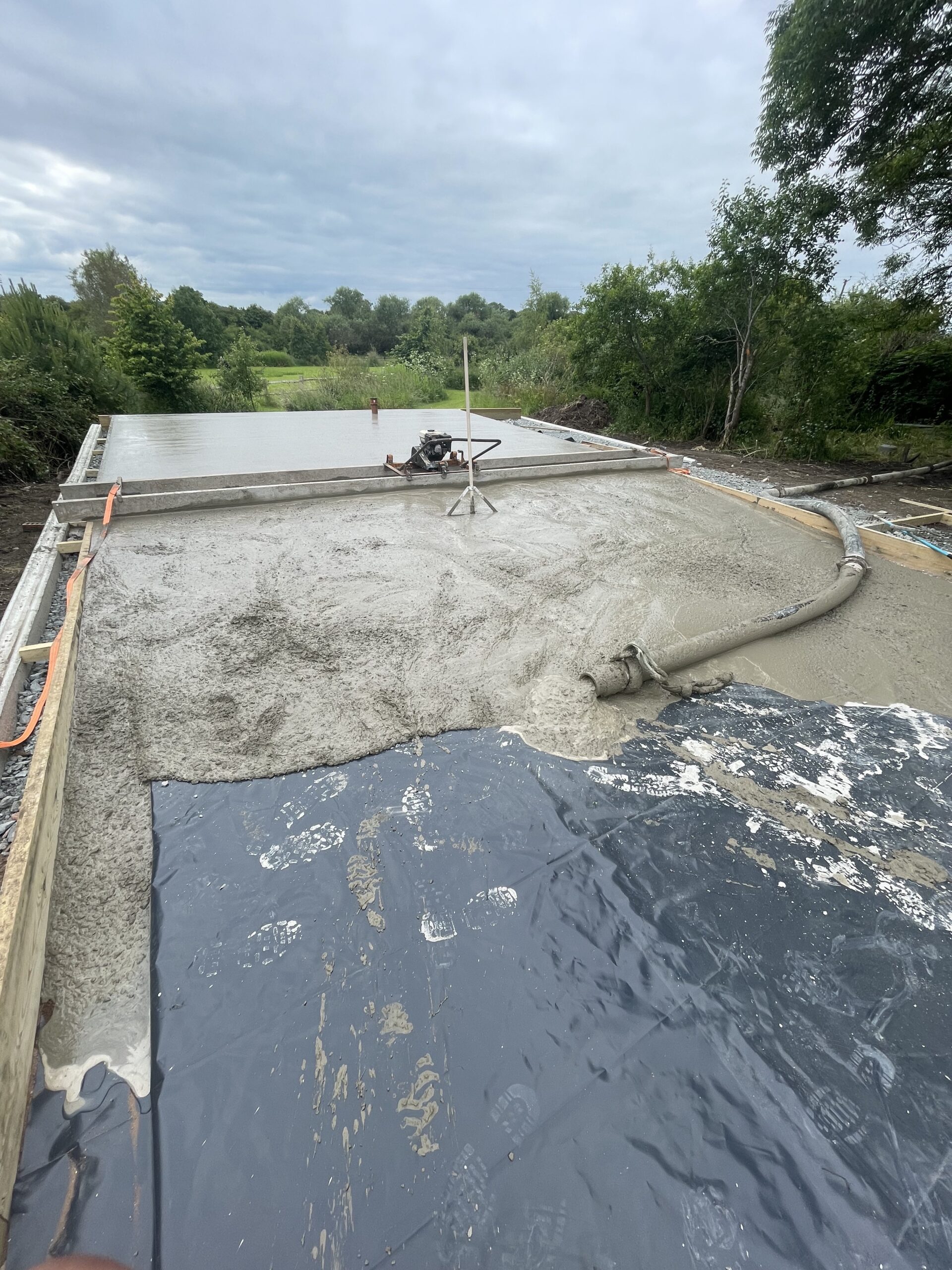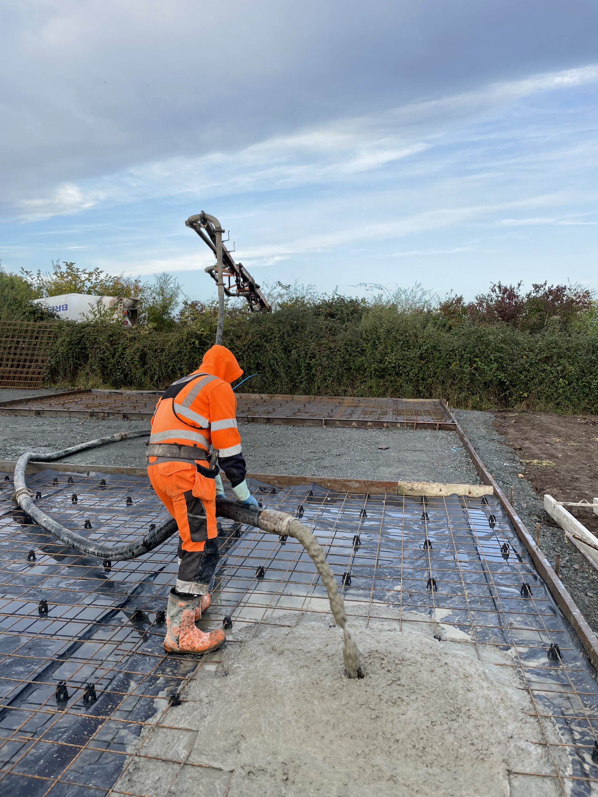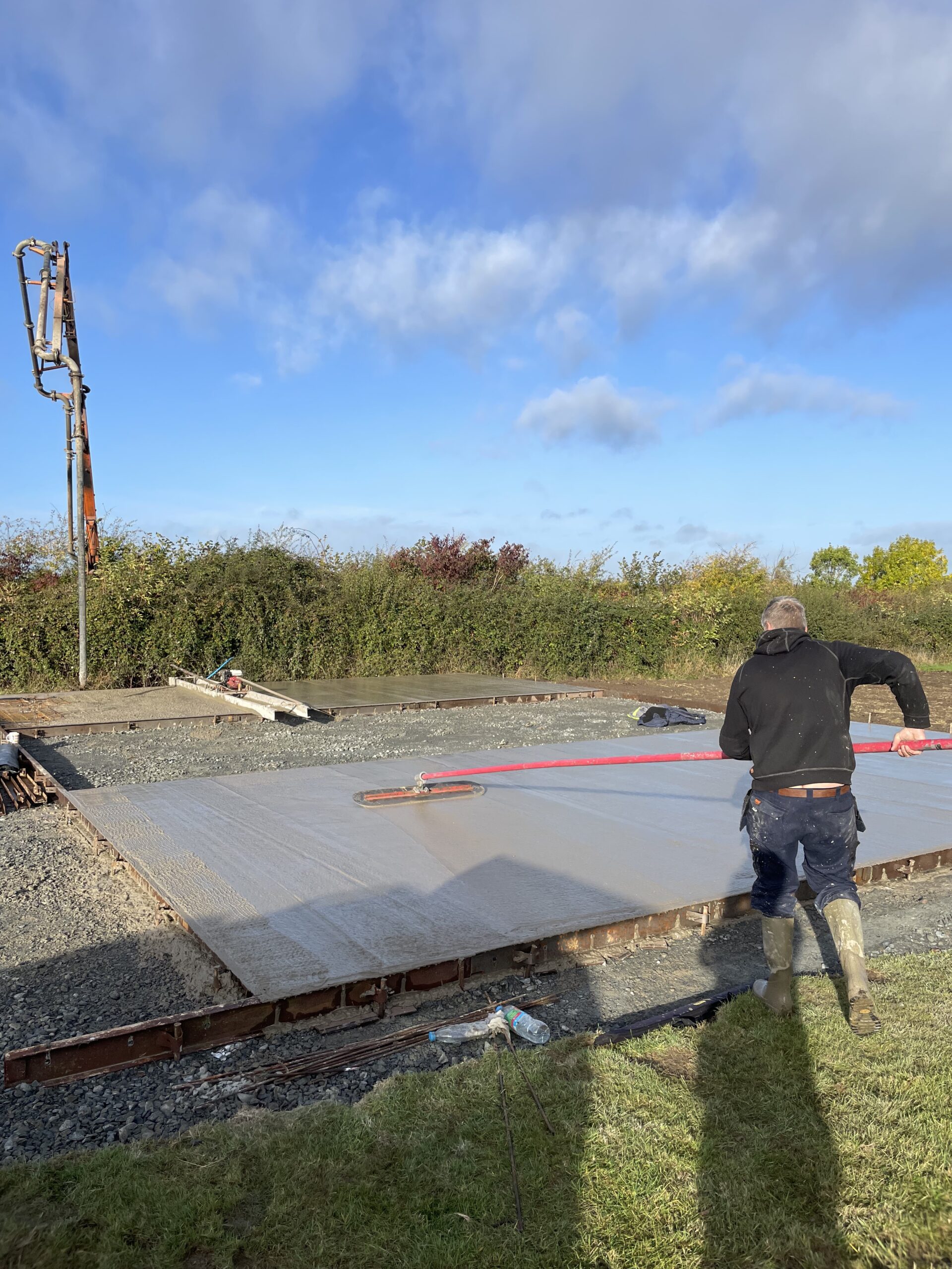 The project was to build an insulated concrete pad for a new steel framed kit building which the customer built. The designated site area was dug off, levelled and the area retained with concrete retaining panels with steel intermediate posts concreted in 1200mm deep. A pumping station was installed for the buildings W/C and an armoured cabled trench dug. Shuttering was installed to the dimensions provided by the steel building manufacturer, the pad was insulated with 100mm insulation and a DPM membrane both below and above the insulation. Concrete was pumped in and levelled with a power tamper.